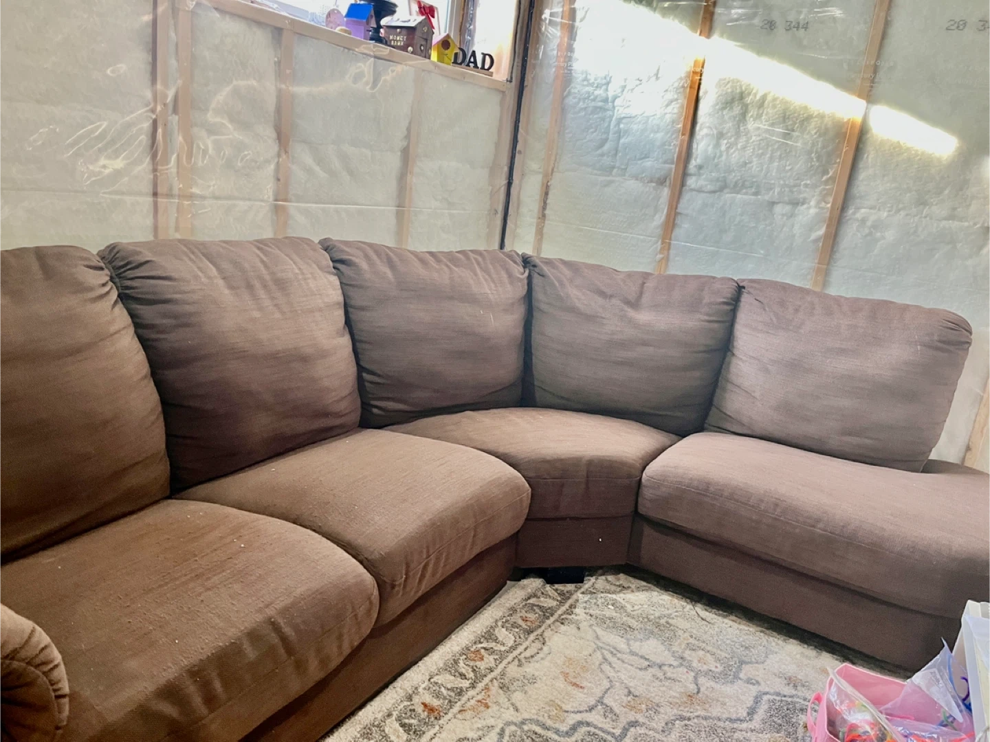 This is a comfortable sectional sofa with a brown fabric finish. It's a great size for a living room or family room. The cushions are plush and inviting.