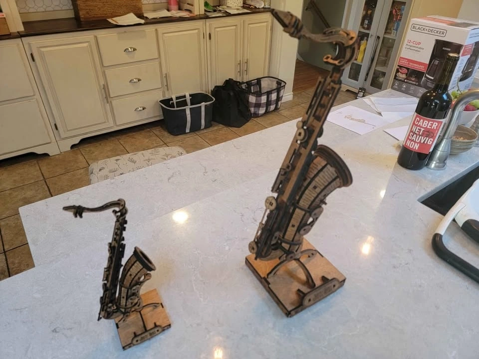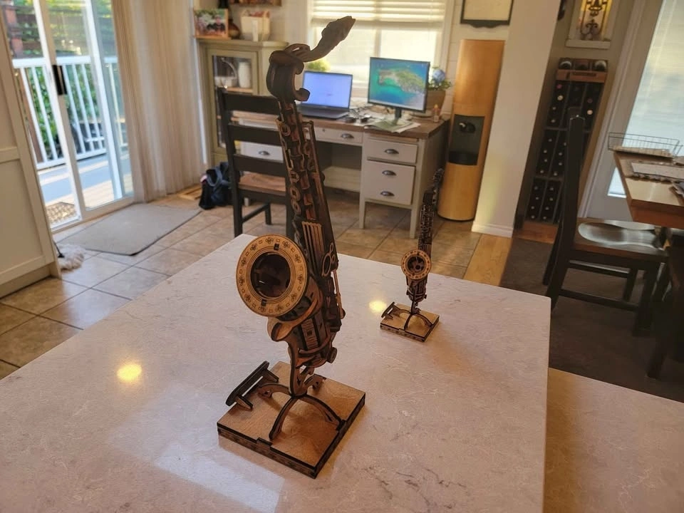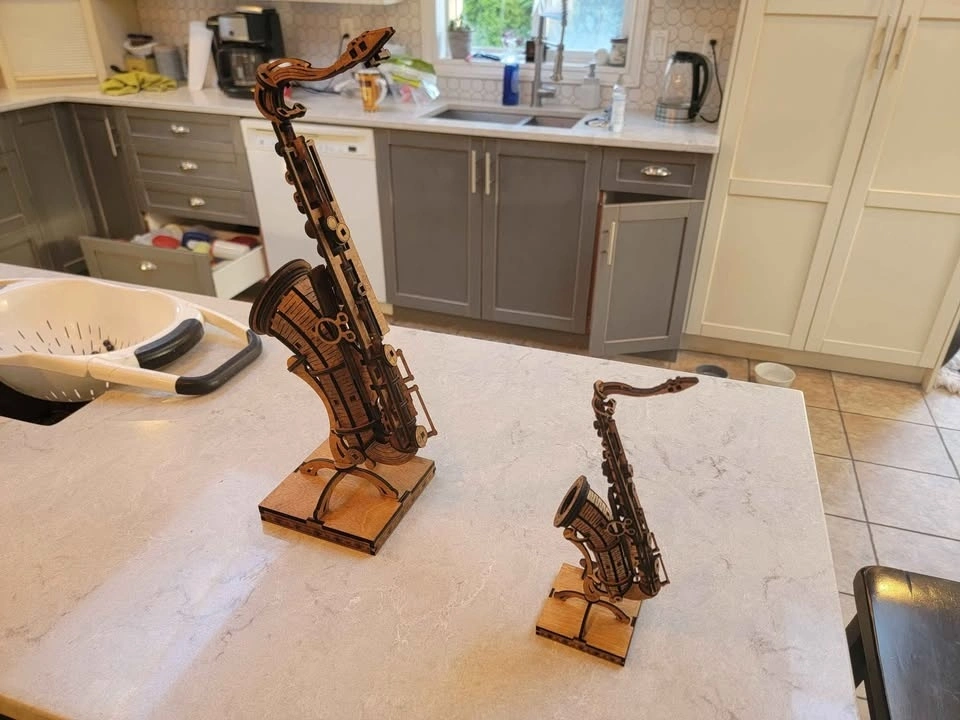 Intricate wooden model of a saxophone for display. Assembled or as a DIY model kit with instructions. Detailed design. Great for musicians. Fantastic gift idea. Two sizes available: Large is 19 inches tall and small is 11 inches tall. Small Saxophone is $50.00. Items are available for pickup by arrangement. I make most of these products myself, so I can usually make more if desired. Feel free to message if you have any questions!