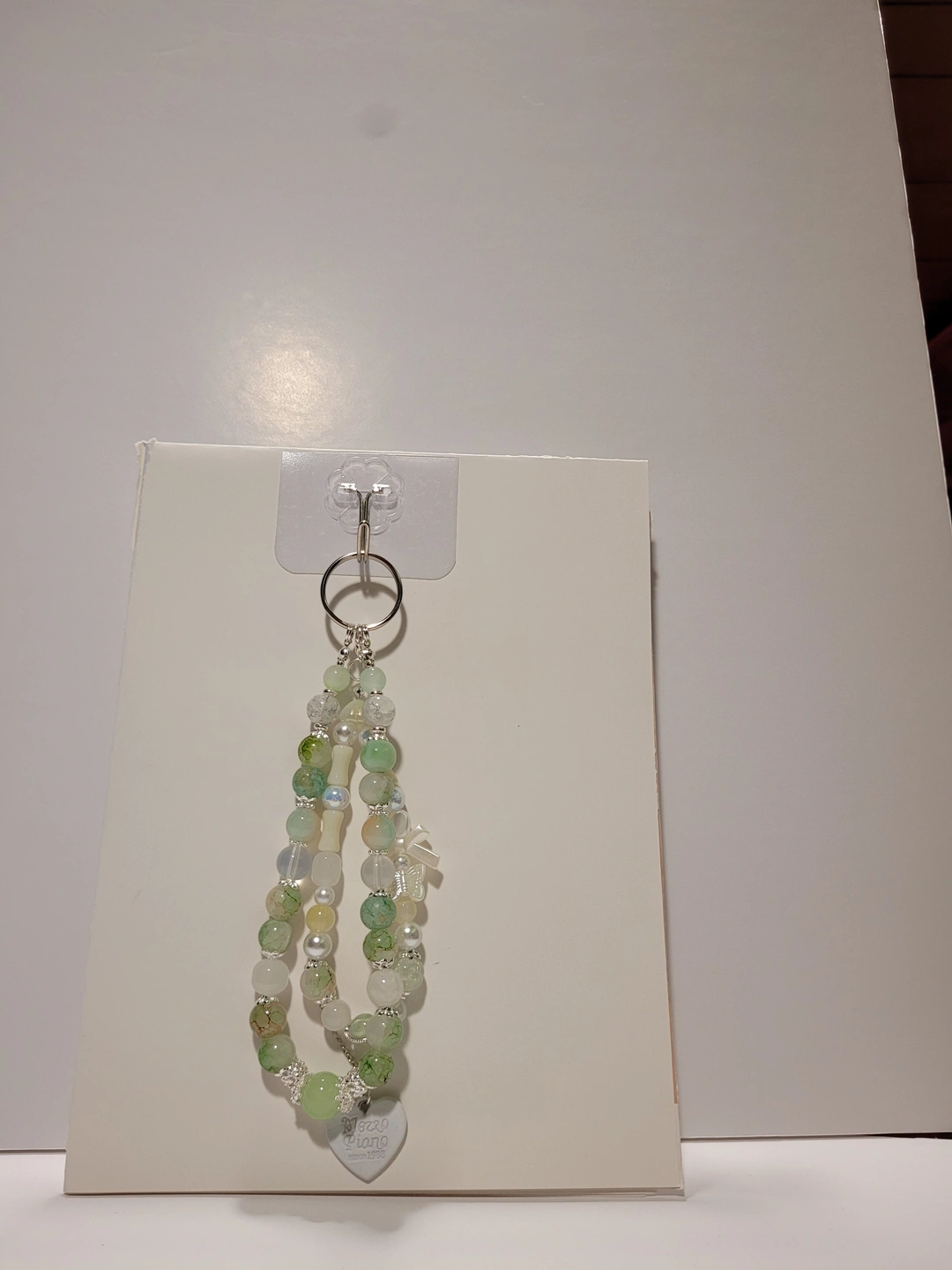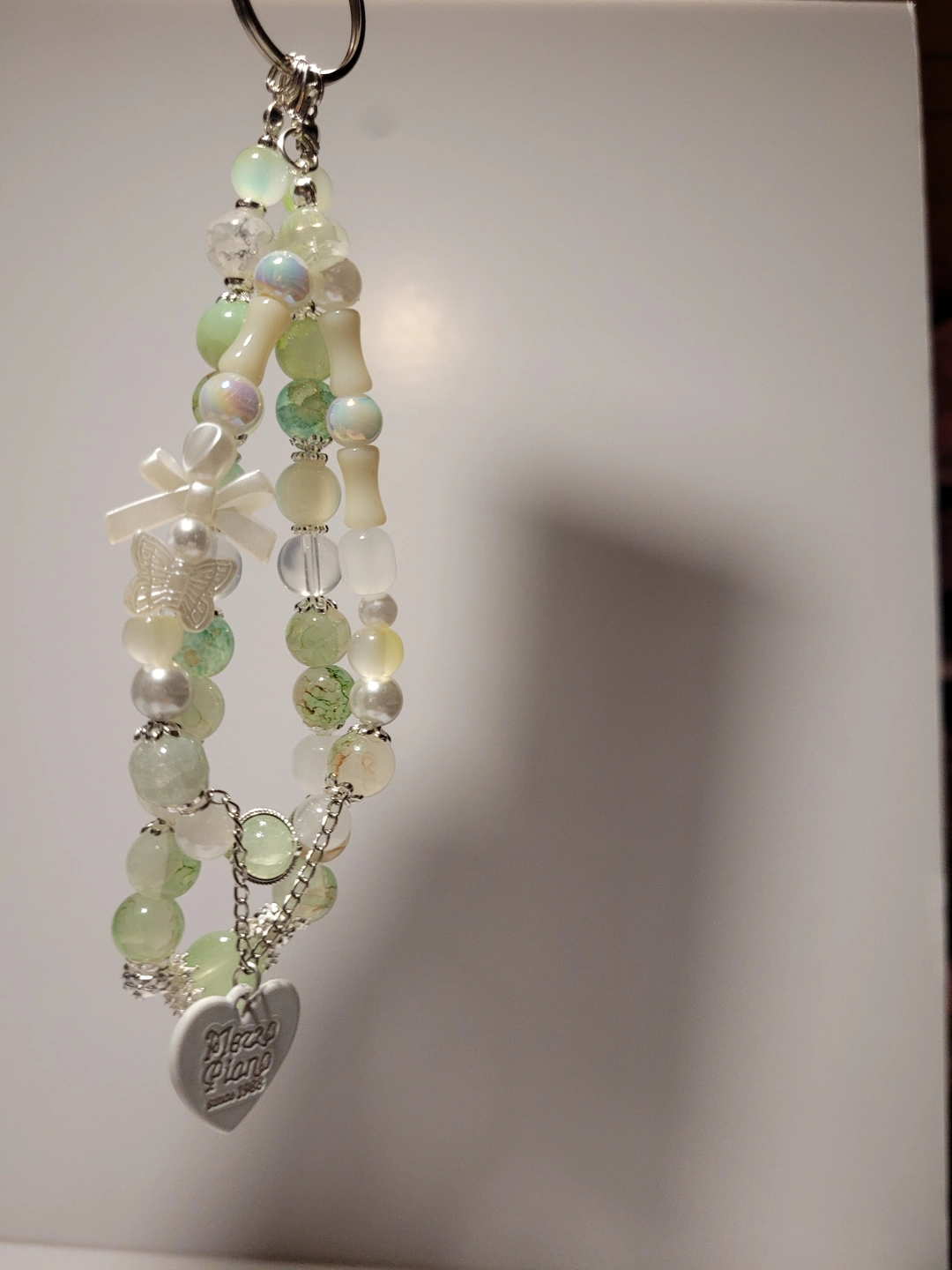 Selling a cute handmade beaded keychain! It features a mix of green and white beads, with a little butterfly and heart charm. Perfect for adding a touch of charm to your keys or bag