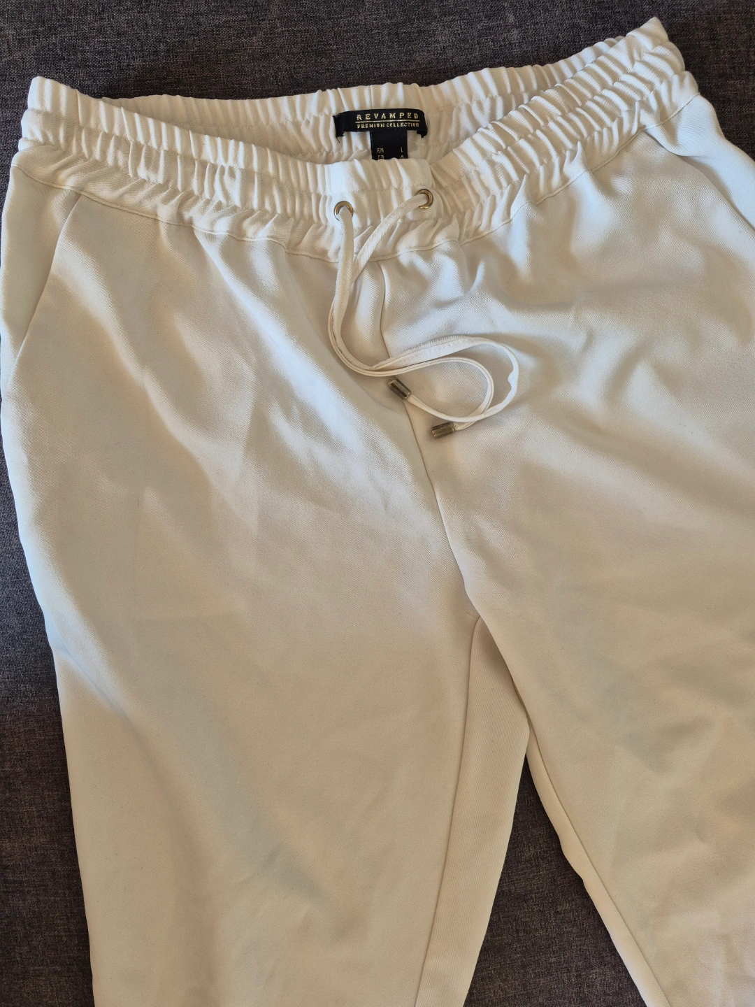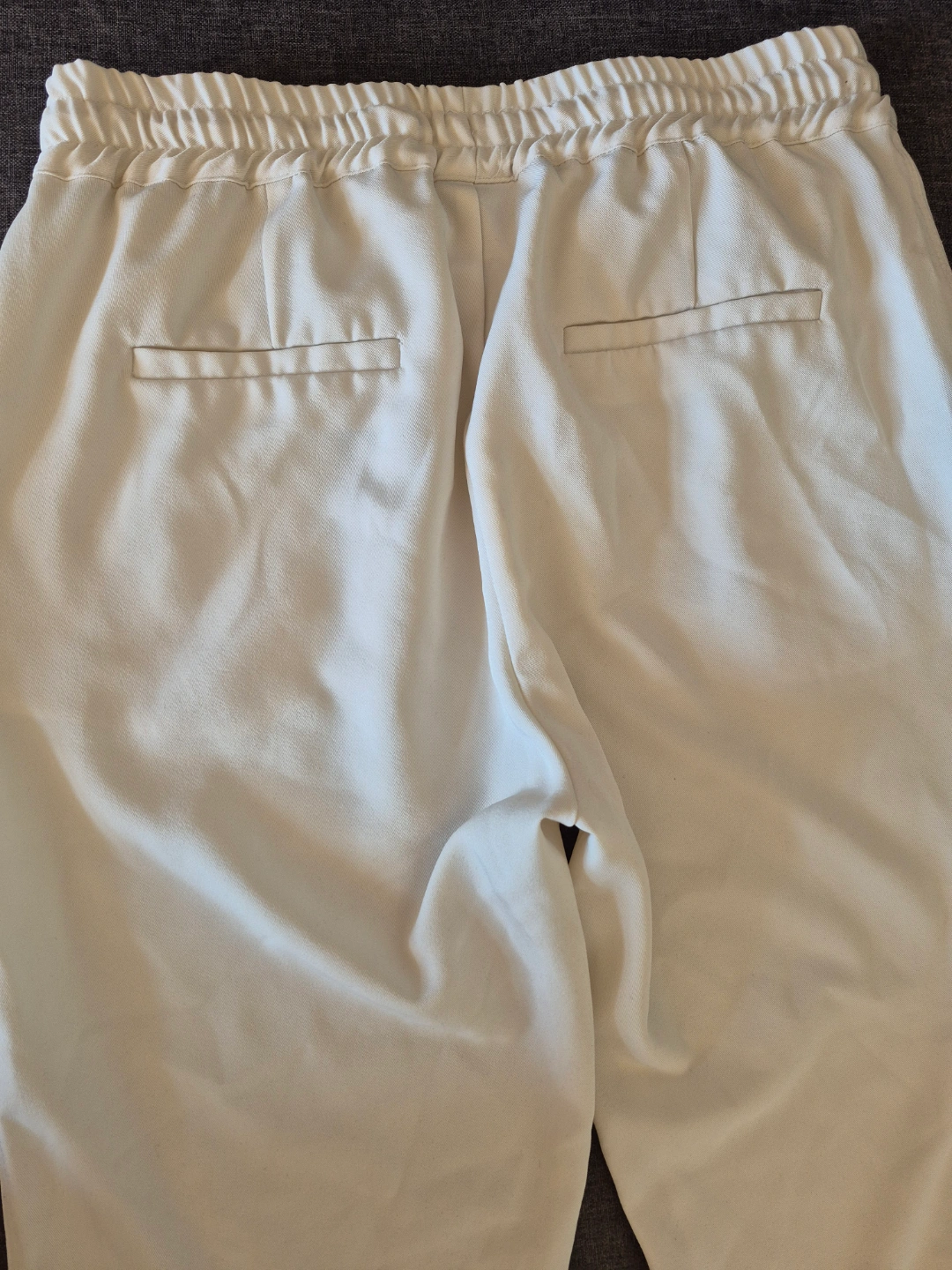 Cream-coloured joggers. Elastic waistband with drawstring. Two pockets. Cuffed ankles. Premium fleece material.