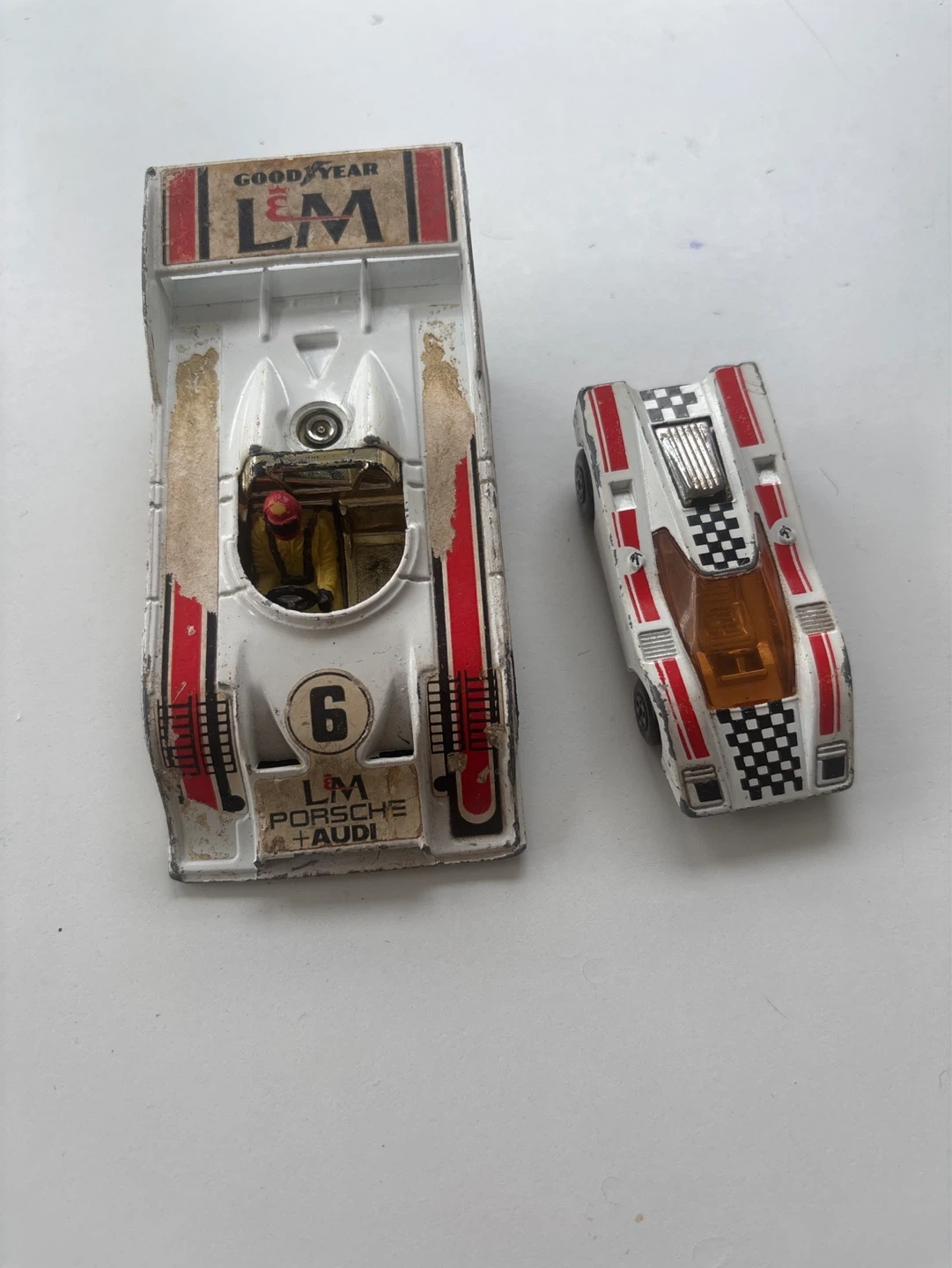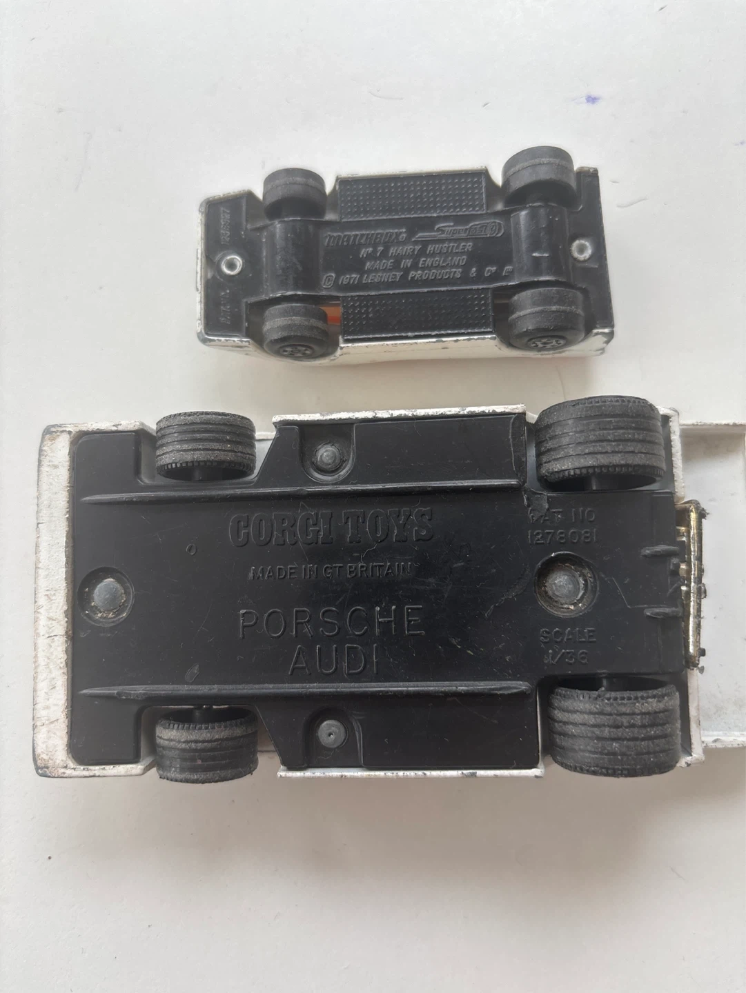 Two vintage toy cars: a Corgi 'Porsche Audi' with scale 1/36 and a Matchbox 'Harry Hustler'. Both show signs of play wear. The Corgi car is white with red and black decals. The Matchbox car is white with red and black accents. Great for collectors!
