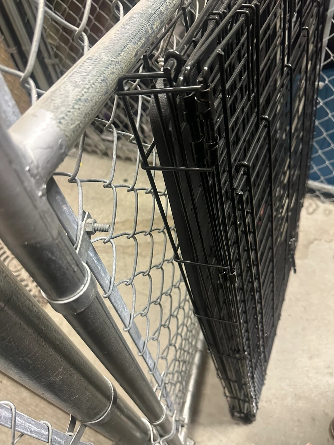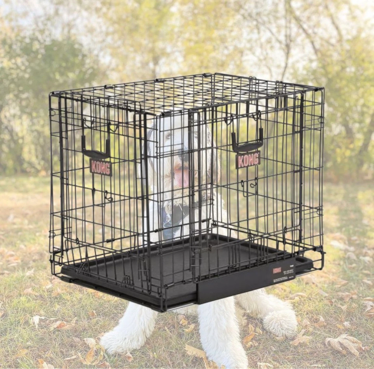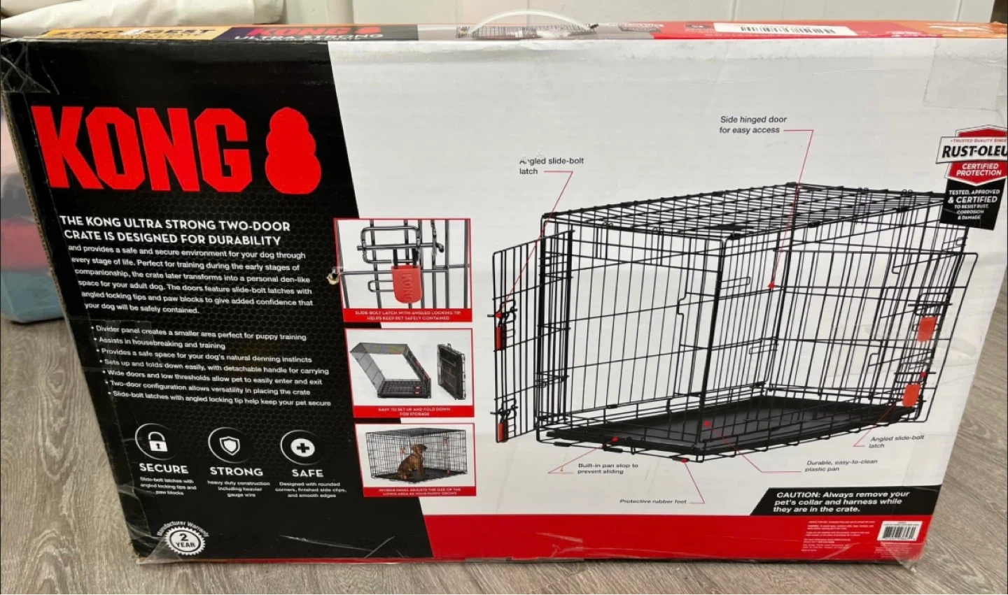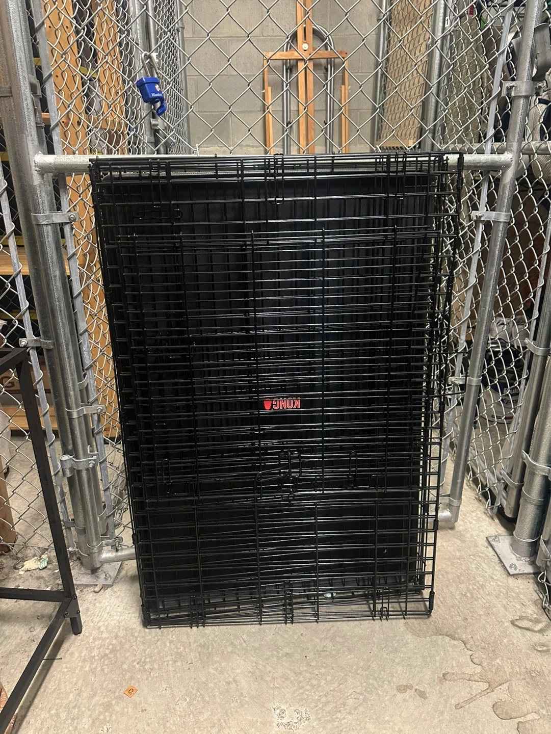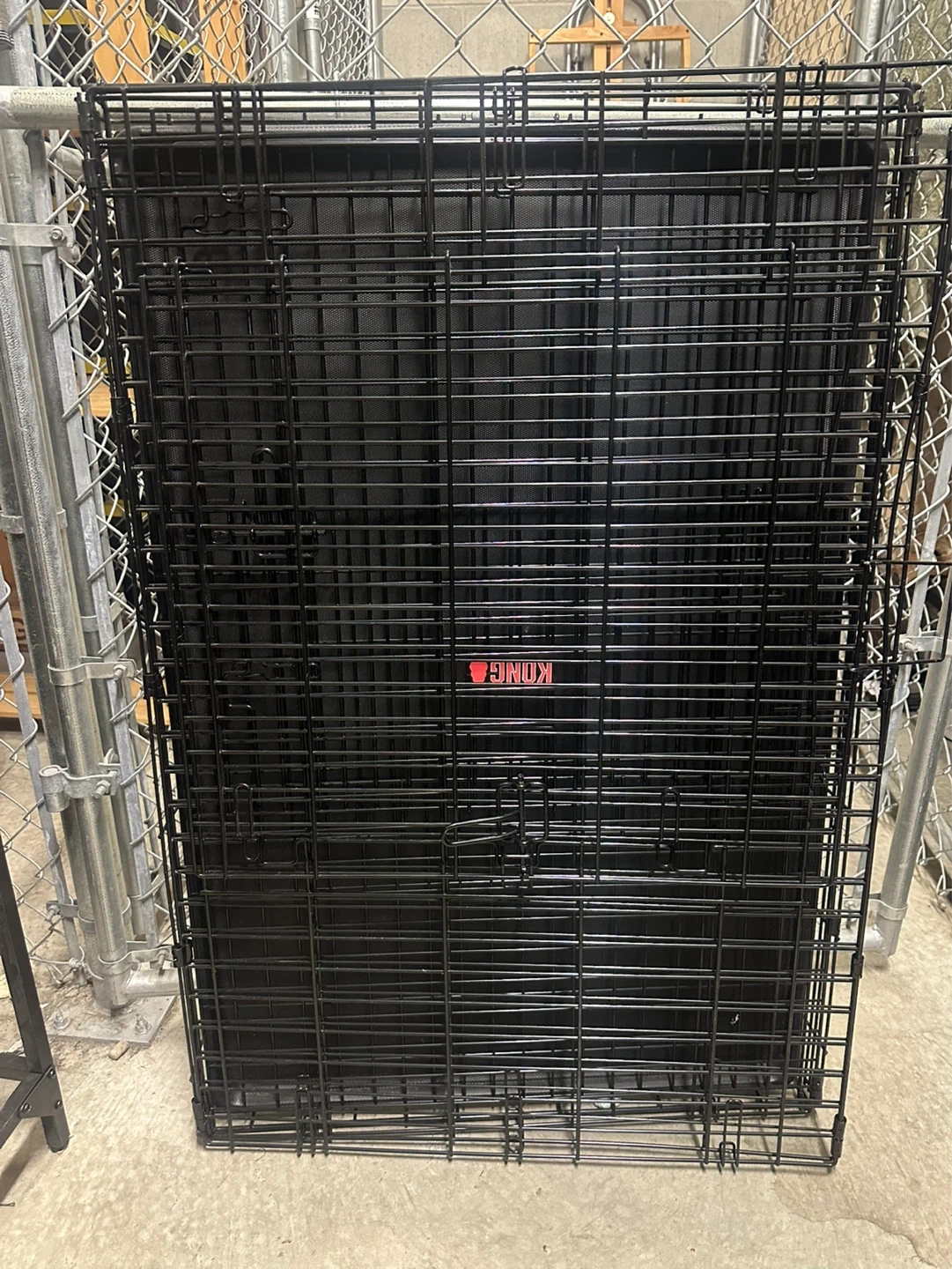 Durable sturdy folding crate to provide a safe and secure dog environment. Triple lock protection, steel construction. Size 43x29x30in accommodates medium-large doc comfortably. Almost brand new.