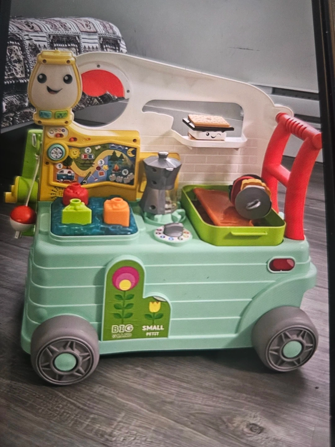 This Fisher-Price Laugh & Learn Camper is a play activity center. It includes a pretend campfire, s'mores, and a coffee pot. It's designed to engage little ones with interactive elements and sounds.