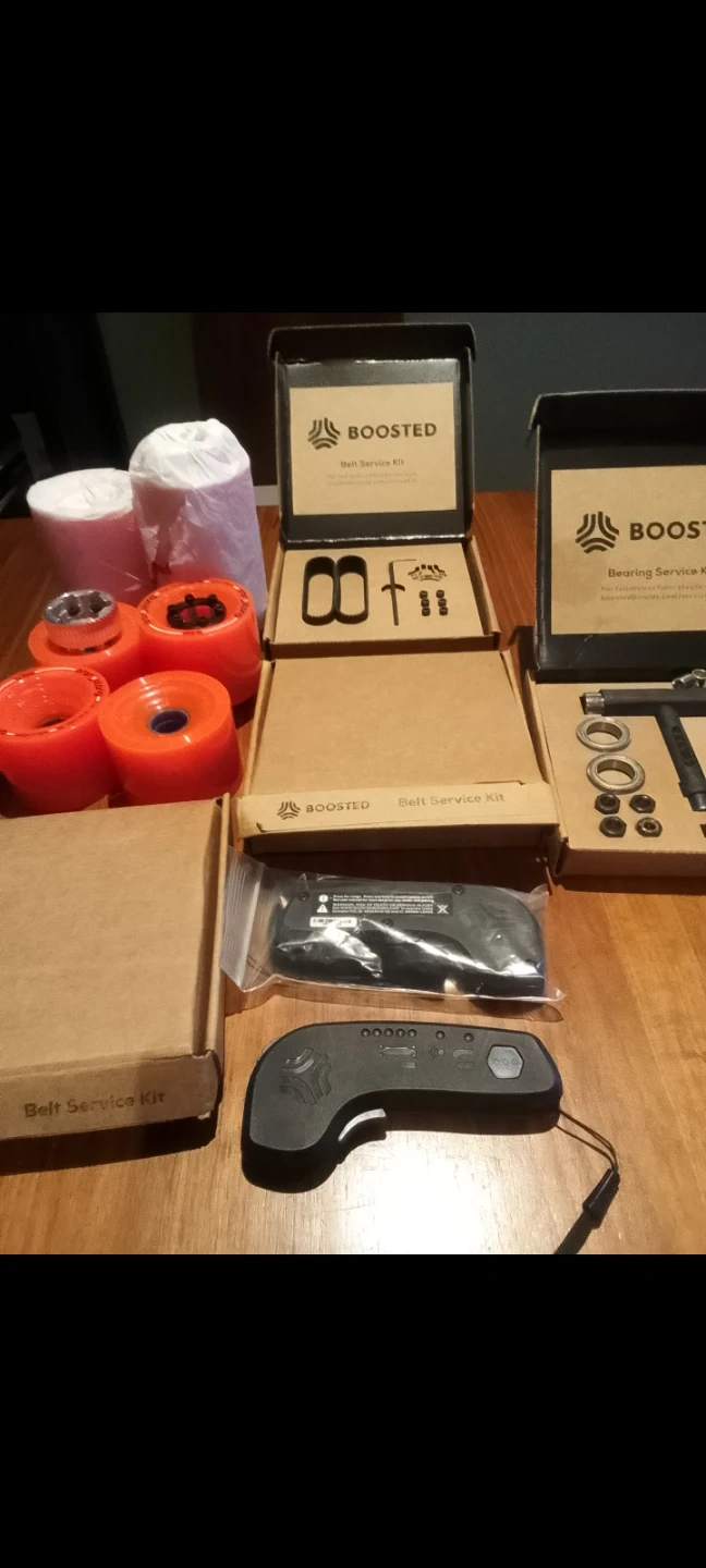 (Brand New) service kits for Boosted Electric Boards ( 1st & 2nd generation), including belt and bearing kits. Also included are Orangatang wheels. Remote controls ( 1 brand new, other for parts only) Everything you need to keep your board in top shape!.