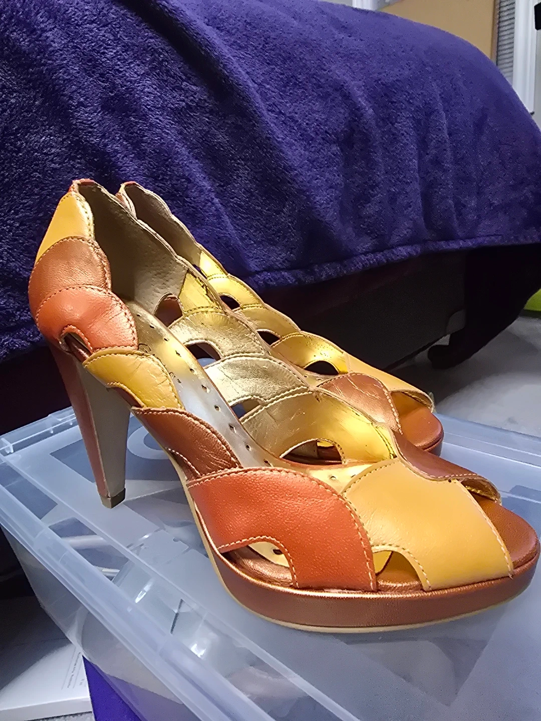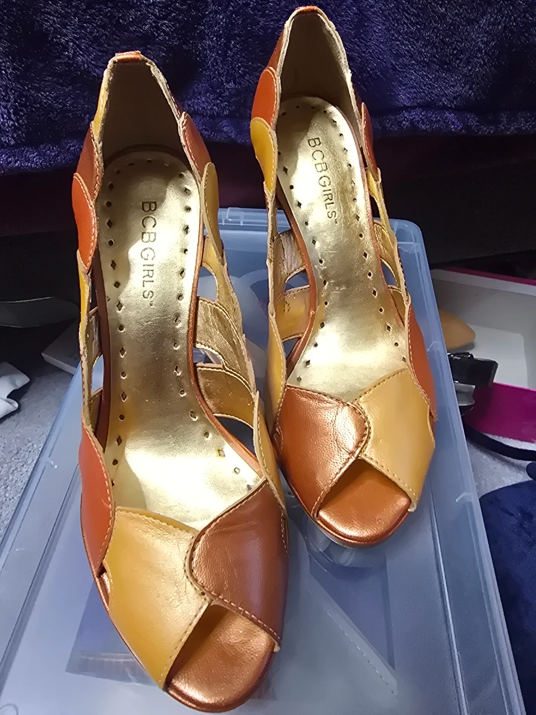 These BCBGirls heels have a stylish colourblock design in orange, yellow, and bronze. They feature a peep-toe front and a stacked heel. Heel height is approximately 4 inches. Great condition...only worn 2 times