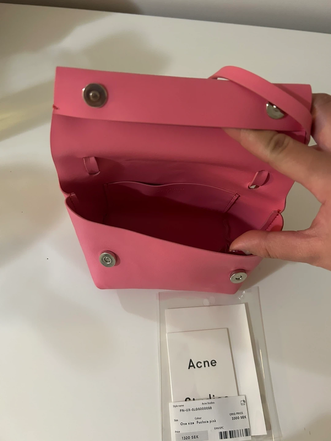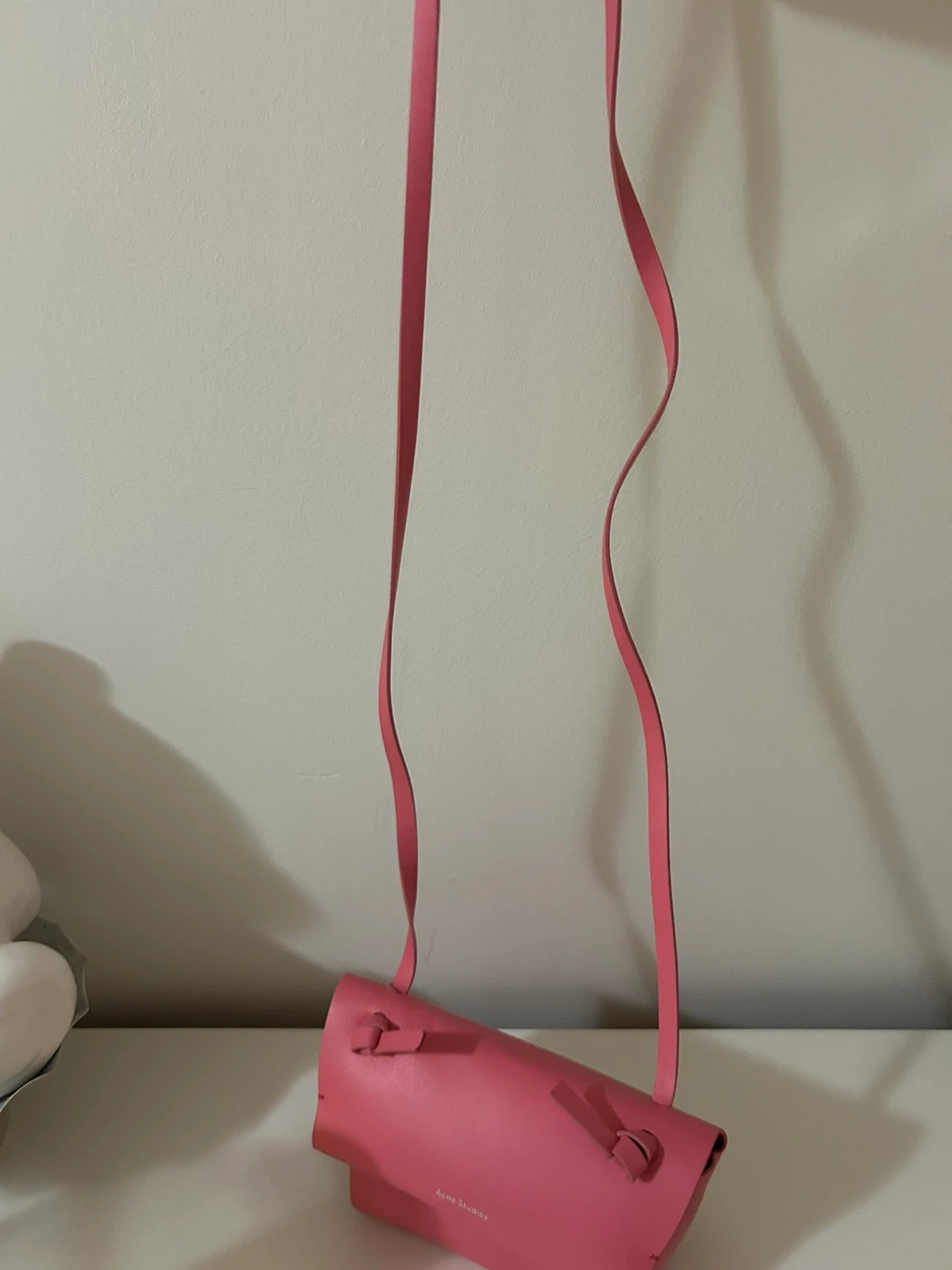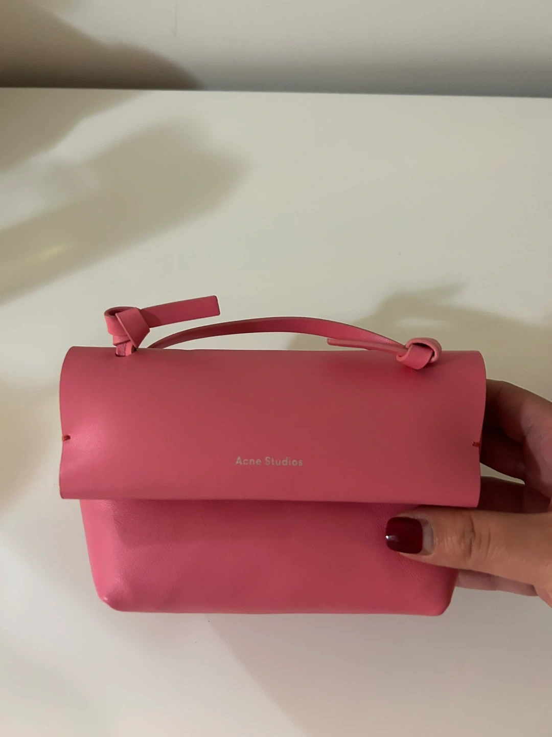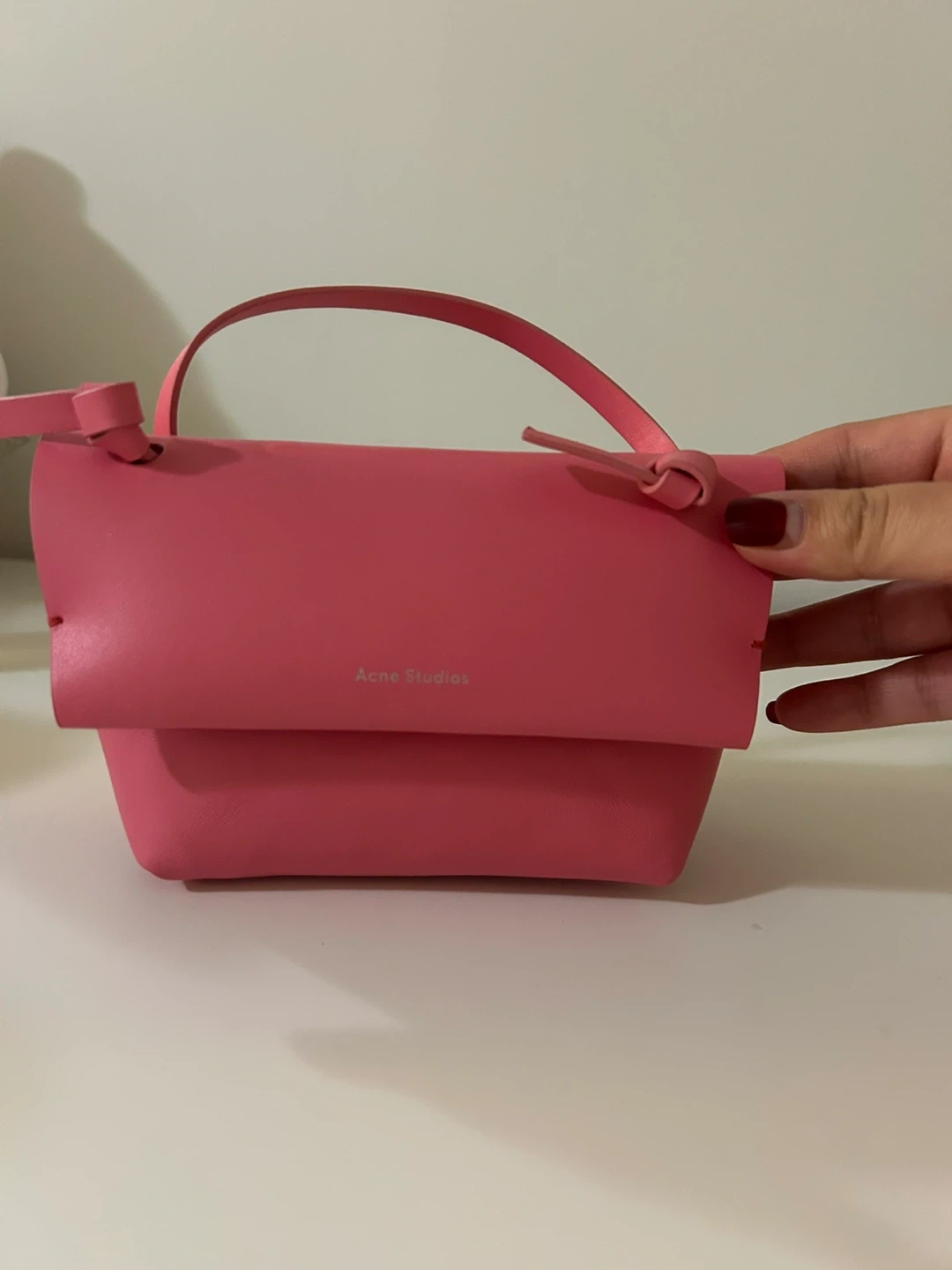 This is an Acne Studios mini bag. It's made of leather. The colour is a bright pink. It comes with a detachable strap.
