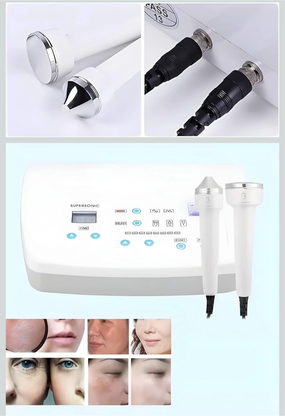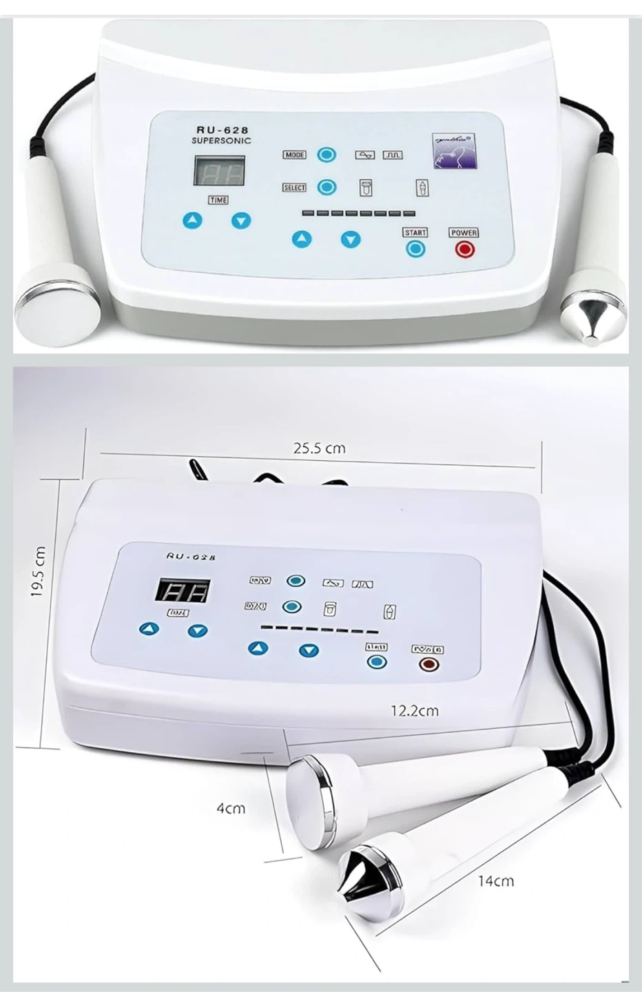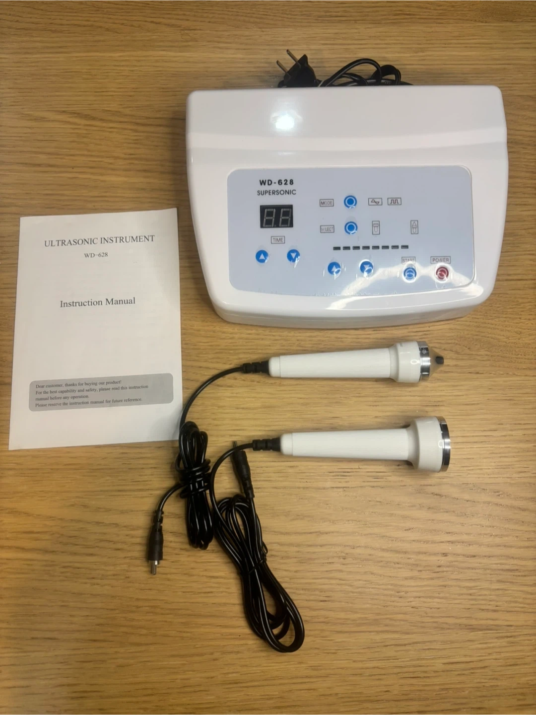 This ultrasonic instrument WD-628 Supersonic comes with two wands for application. The unit has multiple modes and adjustable time settings. It's designed for skin treatments. Dimensions of the main unit are 25.5 cm x 19.5 cm x 12.2 cm.