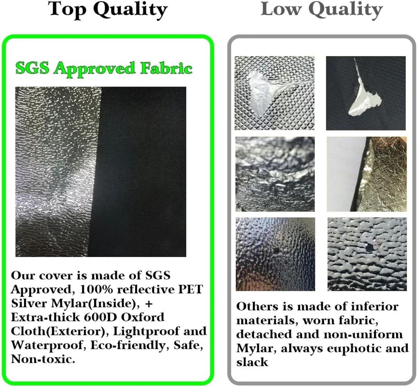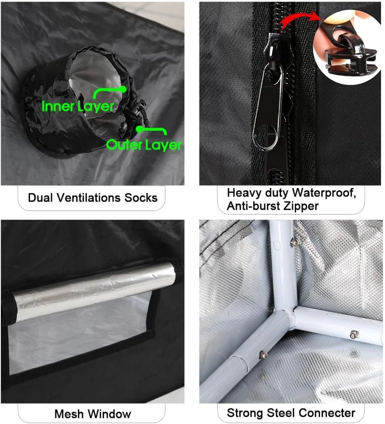 This Quictent grow tent measures 96"x96"x78". It's constructed with SGS Approved fabric, featuring a 100% reflective PET Silver Mylar interior and extra-thick 600D Oxford Cloth exterior. It's waterproof, lightproof, and eco-friendly. It includes dual ventilation socks, a mesh window, and a heavy-duty waterproof zipper. The frame is made of strong steel connectors.