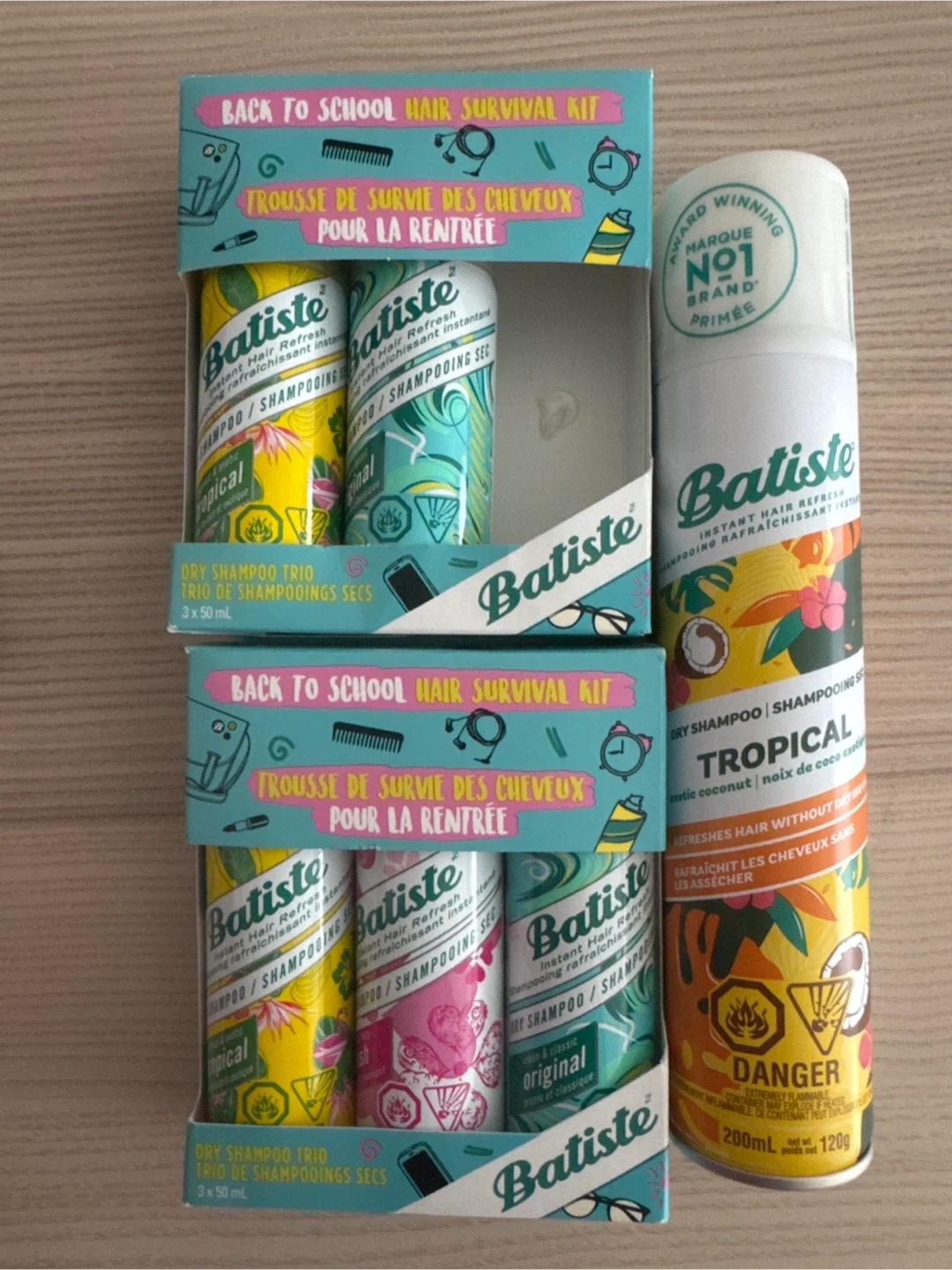 Selling a set of Batiste dry shampoos! Includes 'Back to School Hair Survival Kit' (5 x 50 mL each) with Tropical, Original, and other scents. Also includes a full-size Tropical dry shampoo (200mL). Perfect for refreshing hair on the go! Cash only
