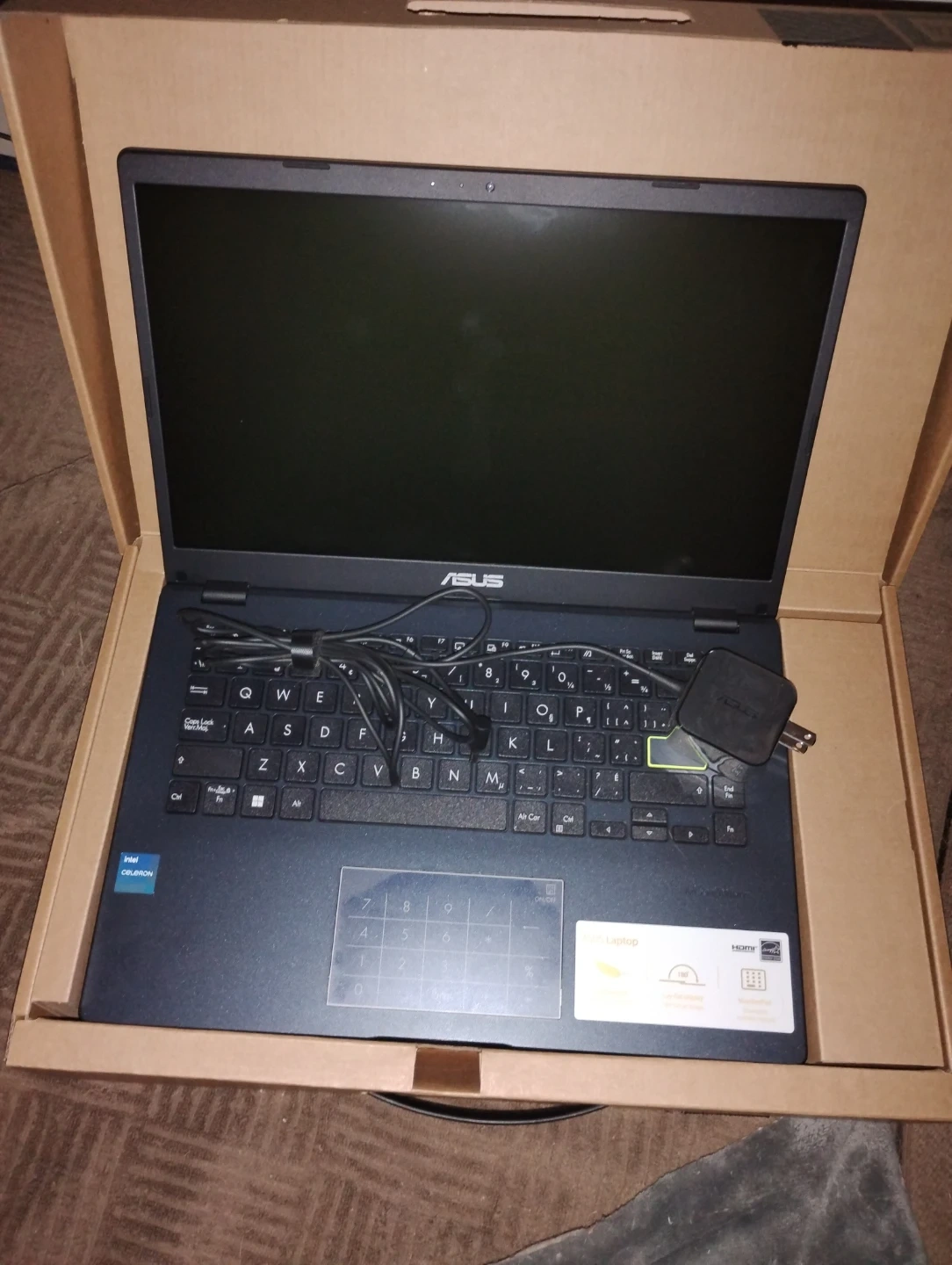 This is an ASUS laptop with an Intel Celeron processor. It comes with its original box and charger. Perfect for everyday tasks and browsing!
