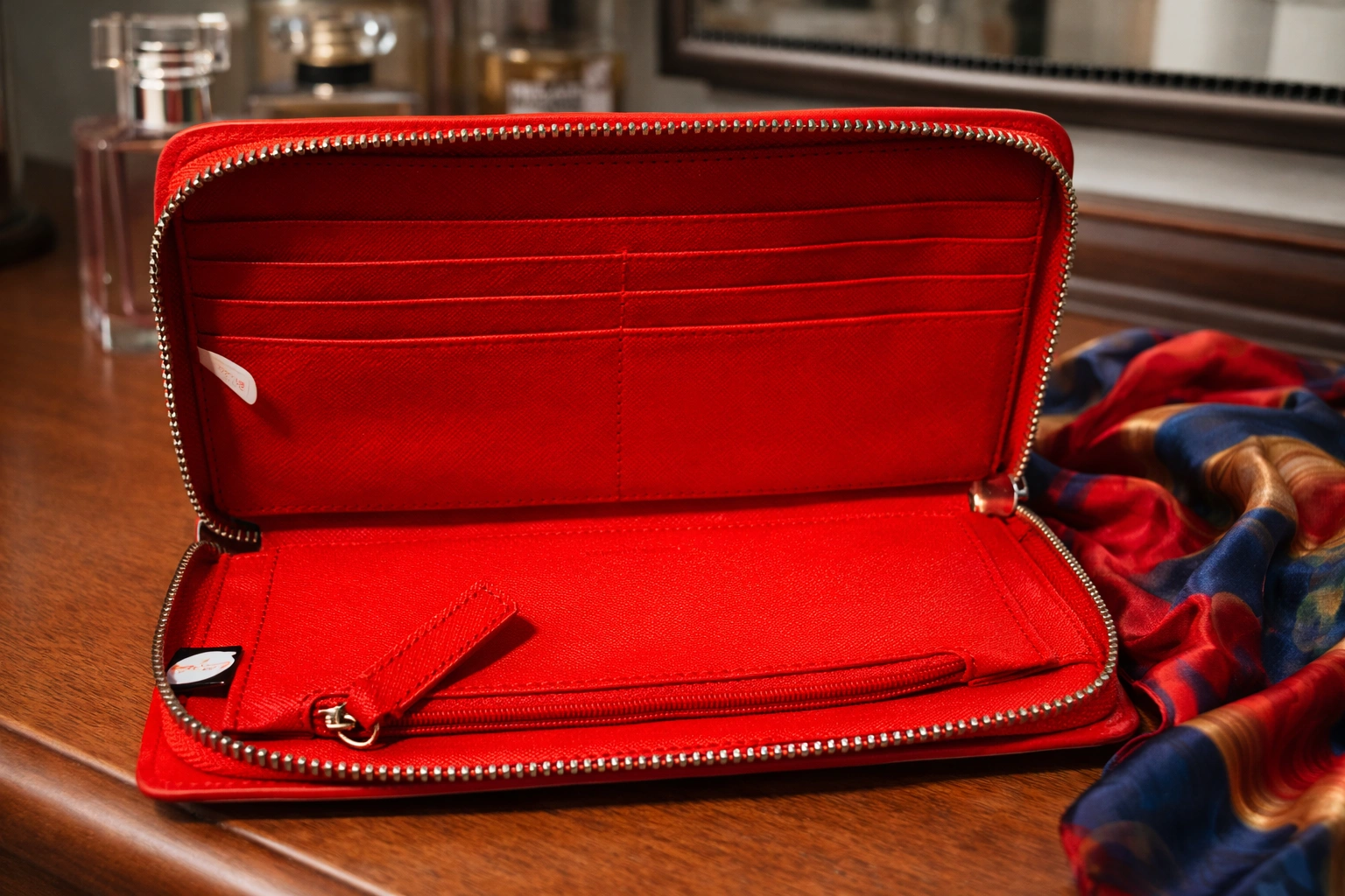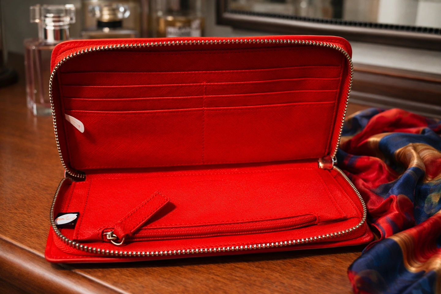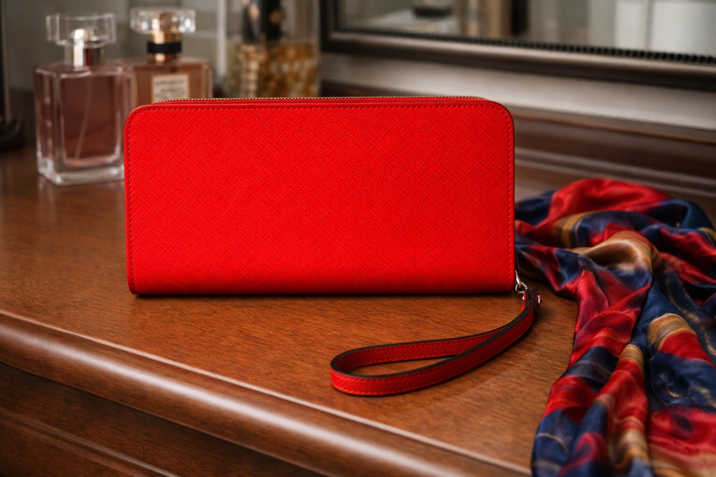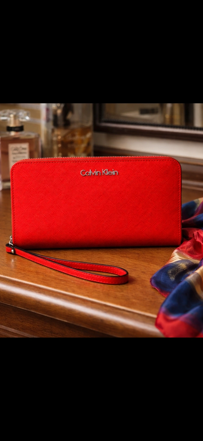 Chic and functional Calvin Klein wristlet wallet in vibrant red saffiano leather. Zip-around style with multiple card slots, bill compartments, and a secure interior zip pocket. Structured, durable leather with wrist strap for easy carry.