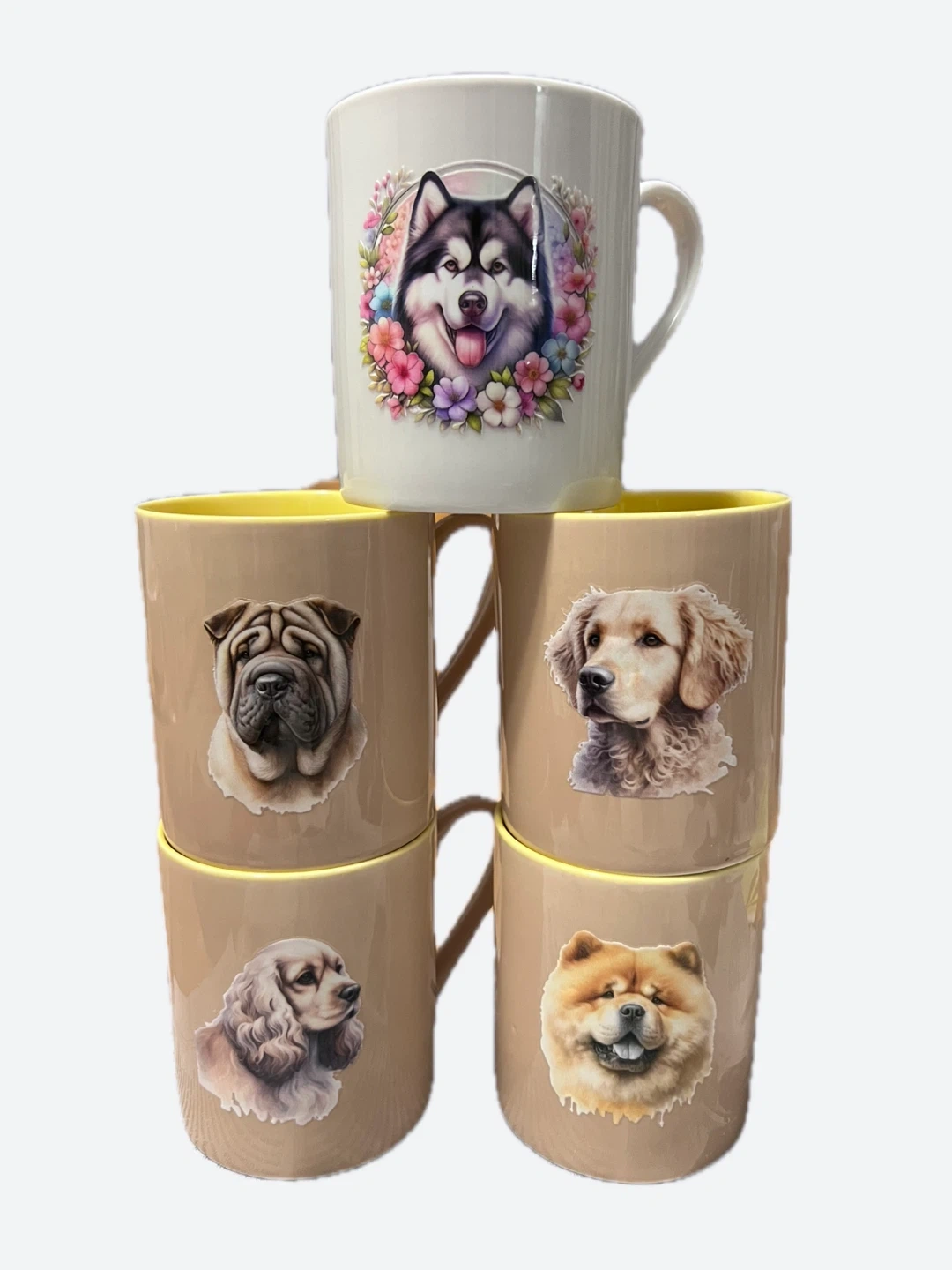 This set includes five ceramic mugs, each featuring a different dog breed design. The mugs have a tan exterior with a yellow interior and a sturdy handle. They're perfect for any dog lover's morning coffee or tea!