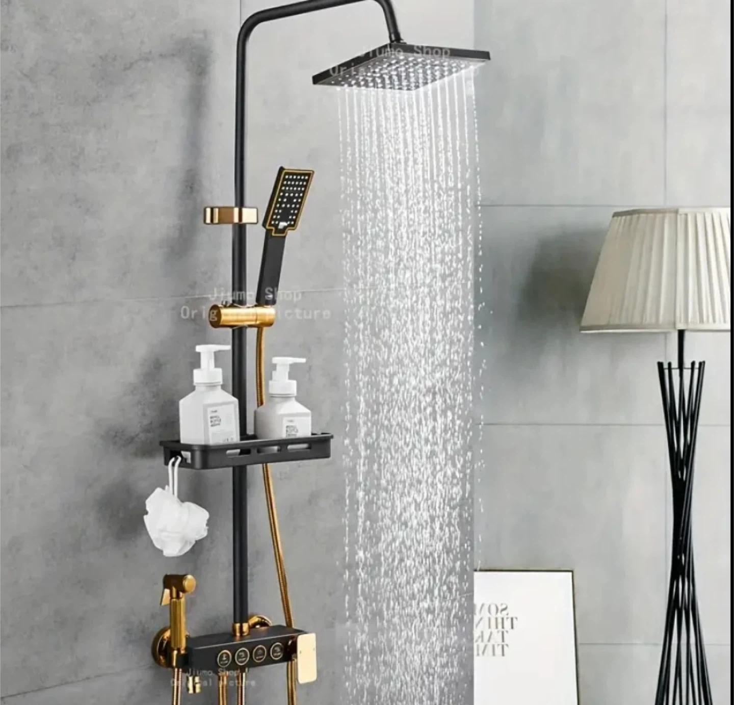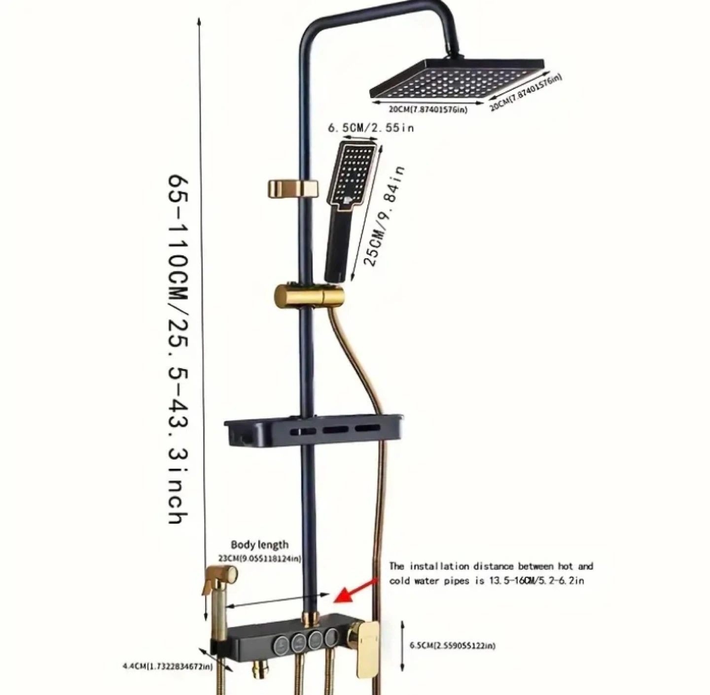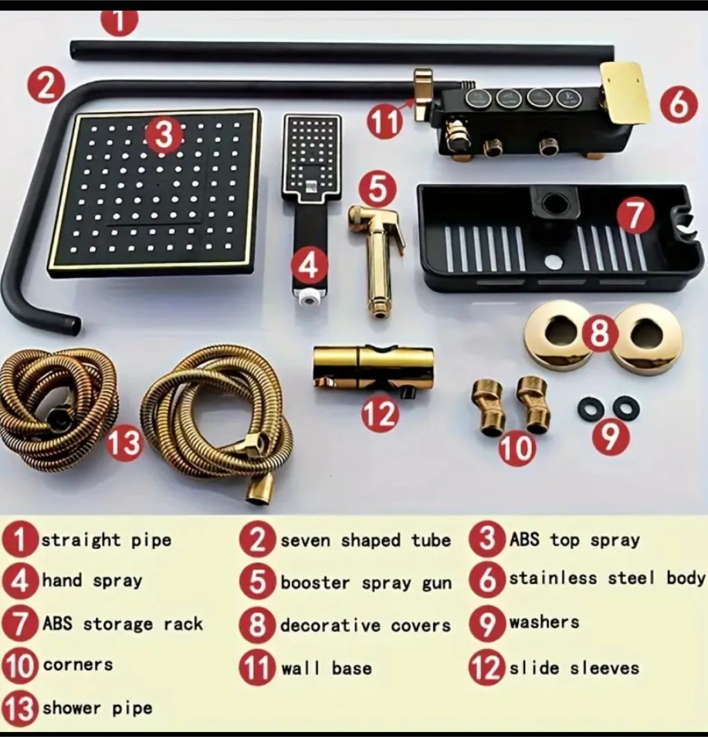 This is a luxury shower set with 4 functions in a black and gold rainfall style. It includes a straight pipe, seven-shaped tube, ABS top spray, hand spray, booster spray gun, stainless steel body, ABS storage rack, decorative covers, washers, corners, slide sleeves, and a shower pipe. The installation distance between hot and cold water pipes is 13.5-16CM/5.2-6.2 in. The body length is 23CM (9.055118124in).
