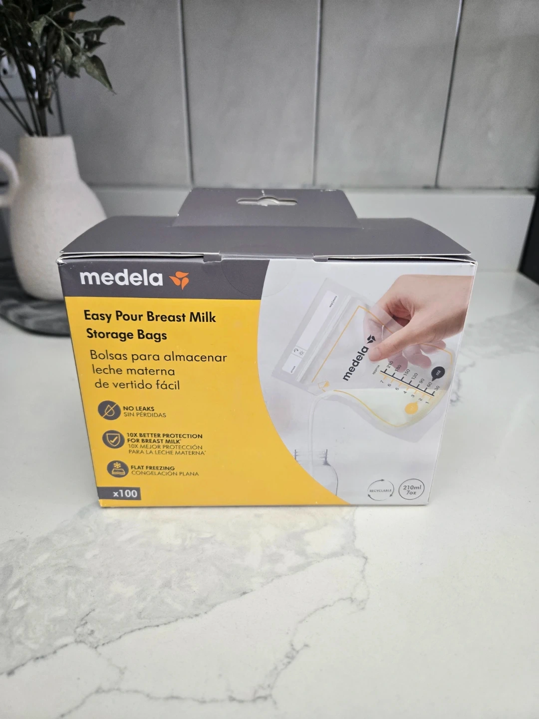Medela Easy Pour Breast Milk Storage Bags. Includes 100 bags. These bags offer no leaks and 10x better protection for breast milk. They're also designed for flat freezing.