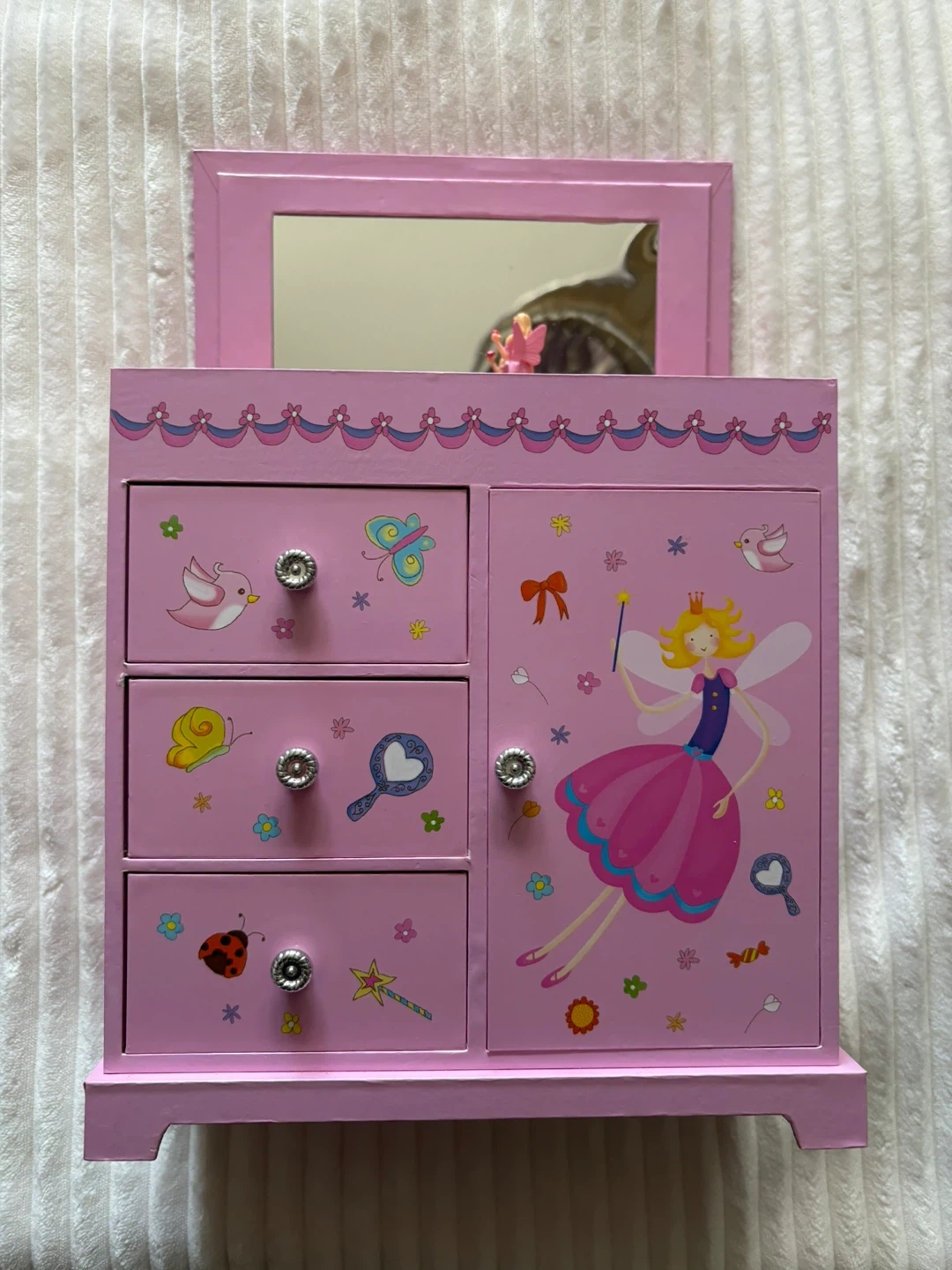 This pink jewellery box features a charming fairy design with three drawers and a side cabinet. It includes a small mirror on top for convenience. Perfect for storing trinkets and treasures!
