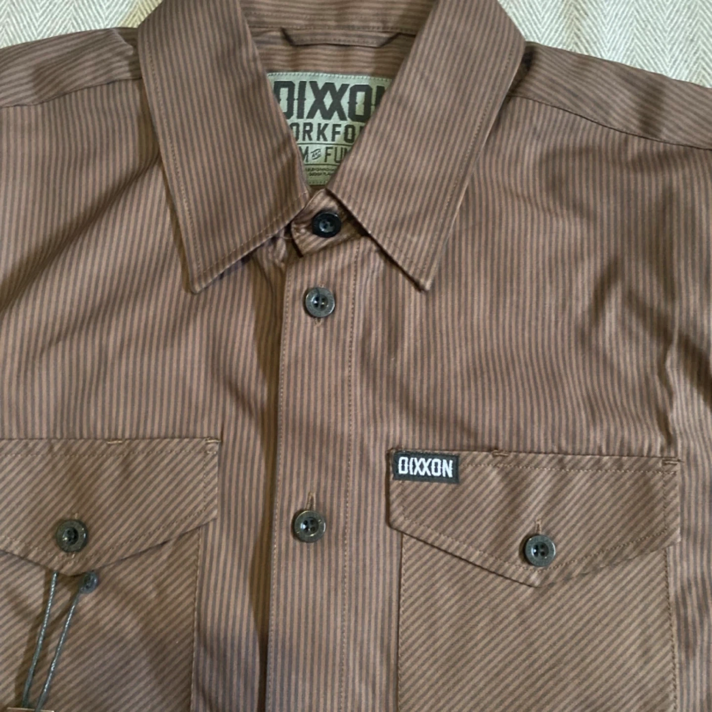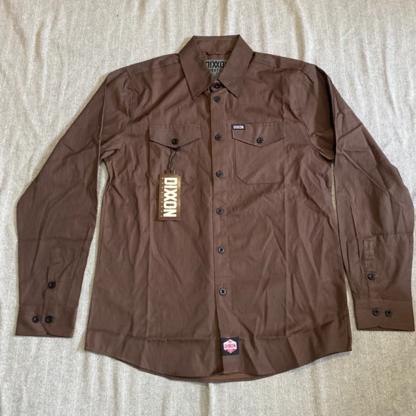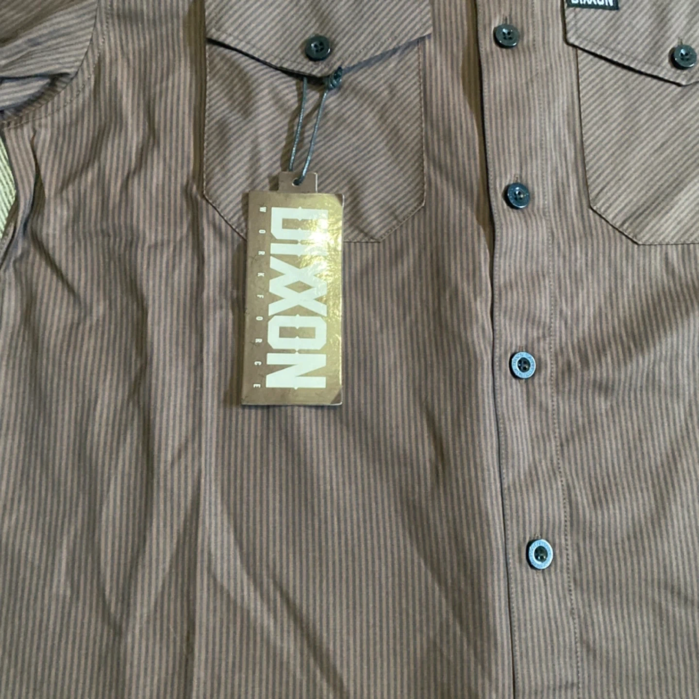 This is a NWT DIXXON WORKFORCE long sleeve button up shirt. It's a brown pinstripe design with two front chest pockets and black buttons. The material is a blend, suitable for work or casual wear.