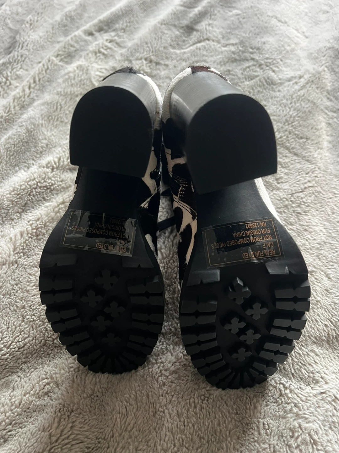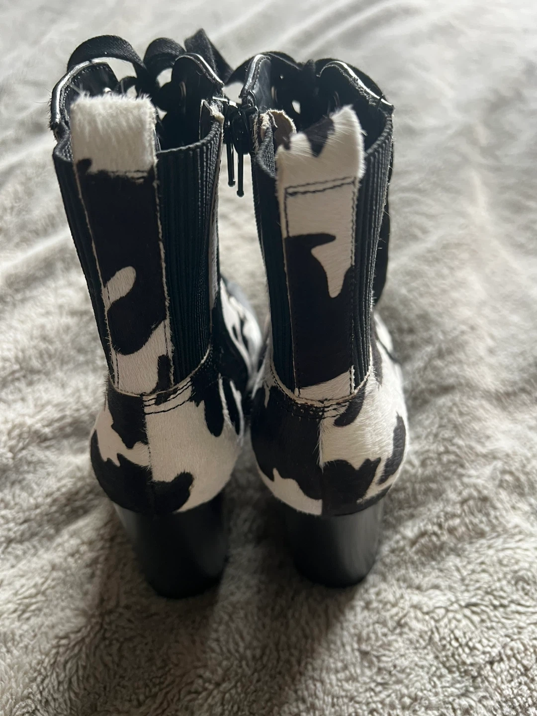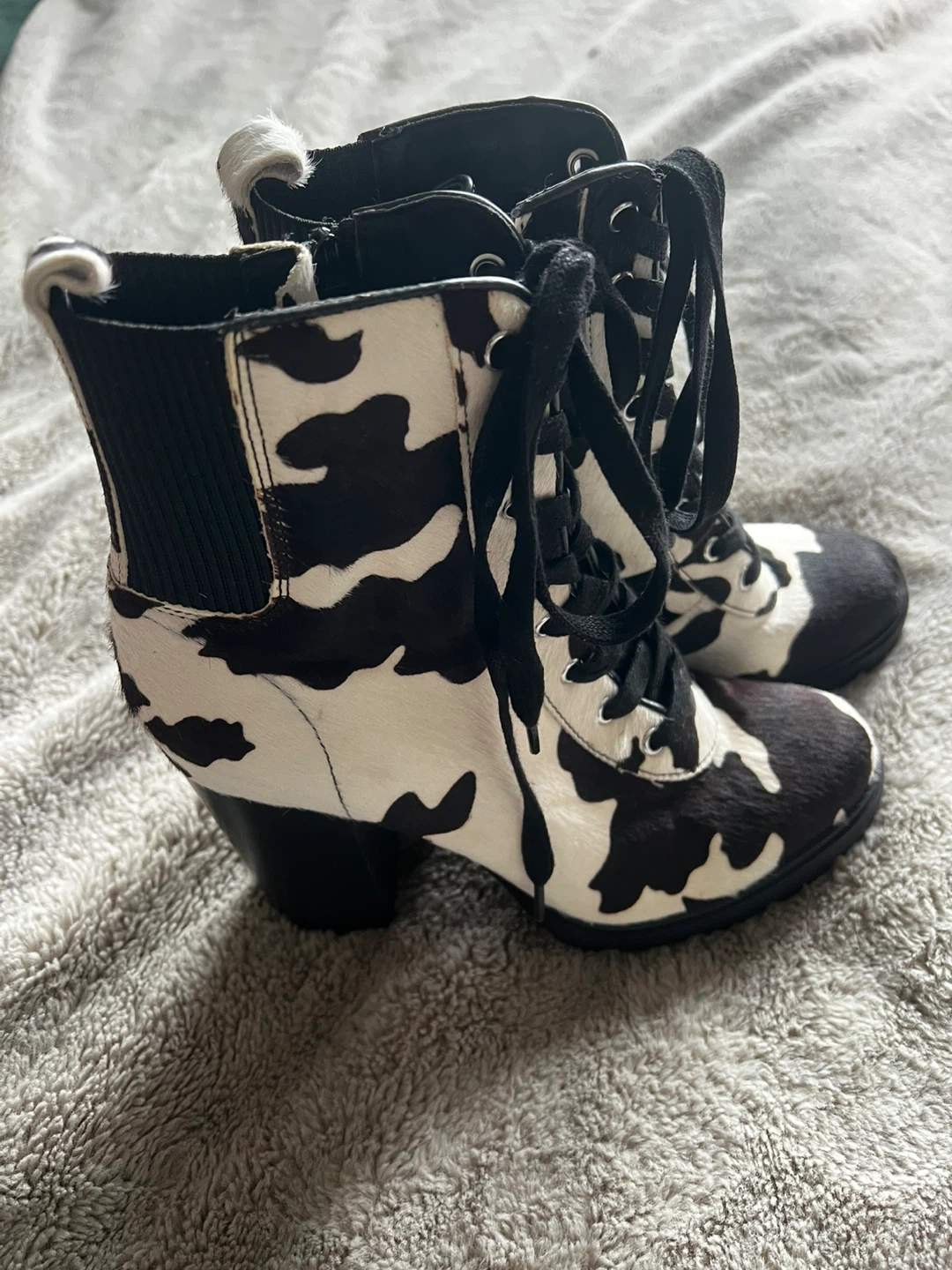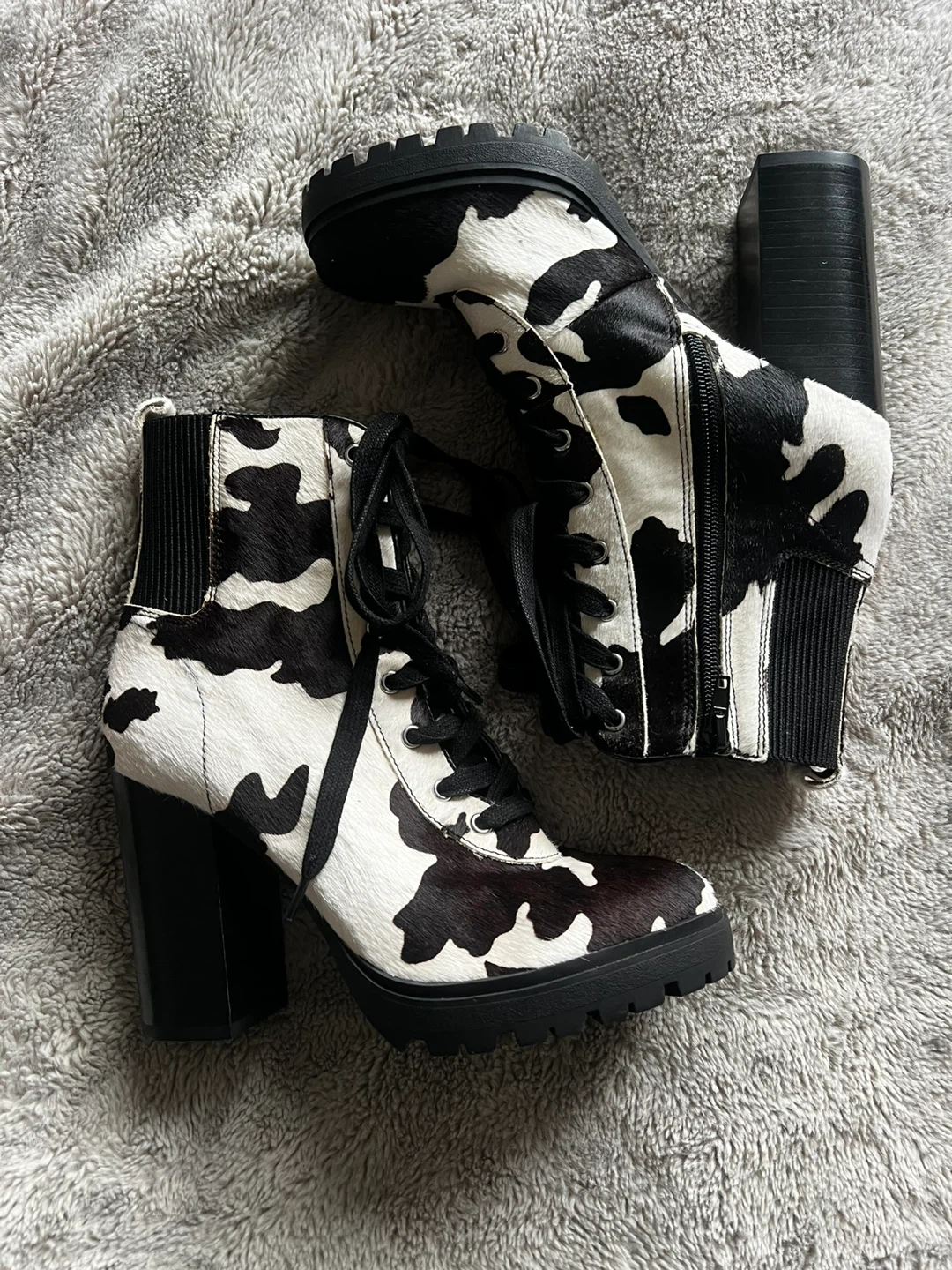 These stylish heeled boots feature a fun cow print design. They have a lace-up front and a side zipper for easy wear. The chunky heel and lug sole offer a trendy look and comfortable support.