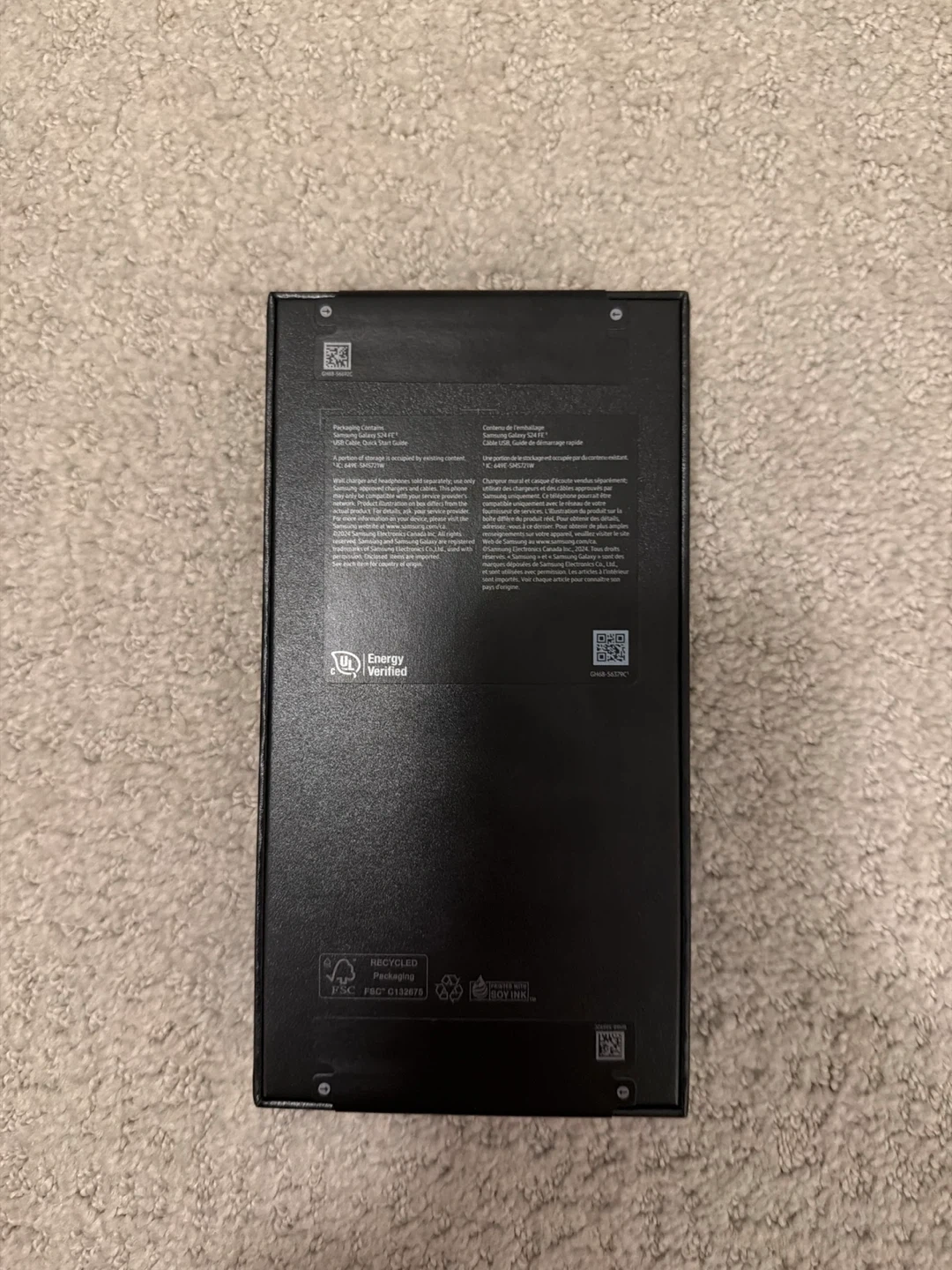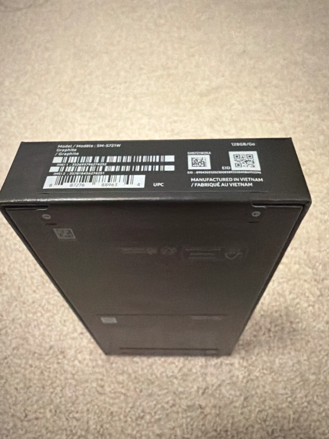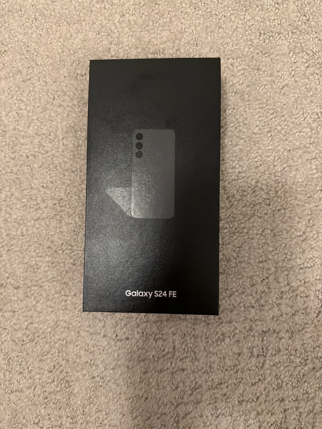 Selling a Samsung Galaxy S24 FE phone in Graphite with 128GB of storage. It's in the original box and includes a clear phone case and a screen protector. Manufactured in Vietnam.