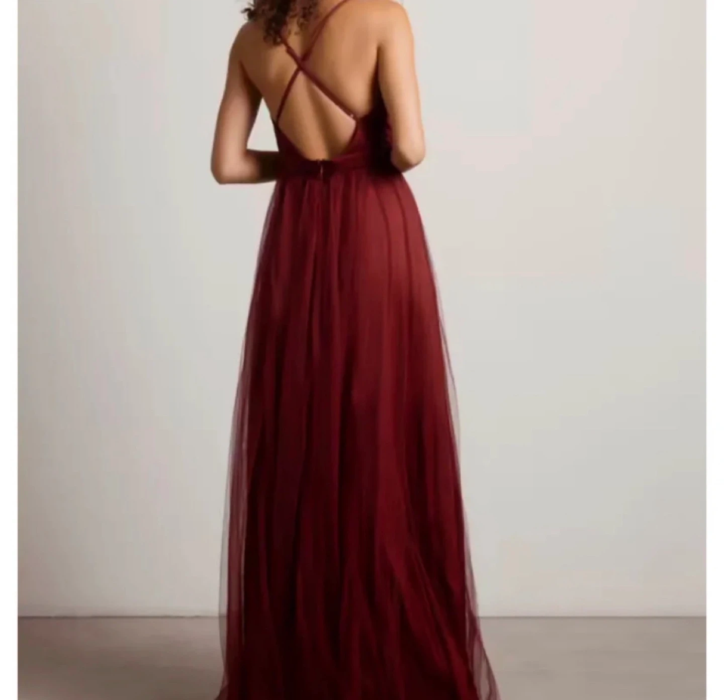 Stunning TOBI red maxi dress with a deep V-neck and crisscross back straps. It's made of a sheer tulle overlay. The M/M size is perfect for formal events. This maxi dress features adjustable straps, slit and a back zipper closure. Complete this flowy maxi dress with a clutch and heels for an elegant wedding guest, holiday party, gala or prom night look.