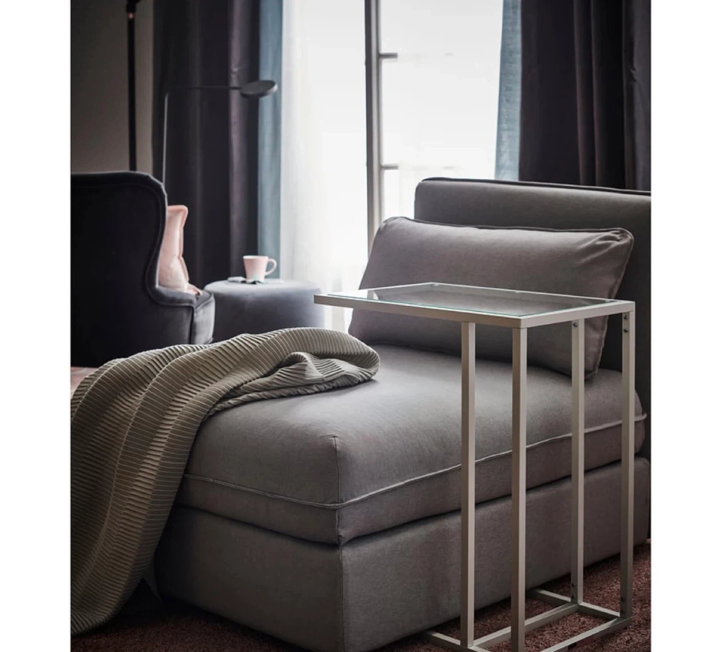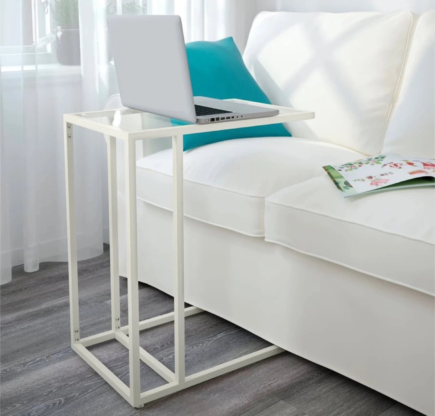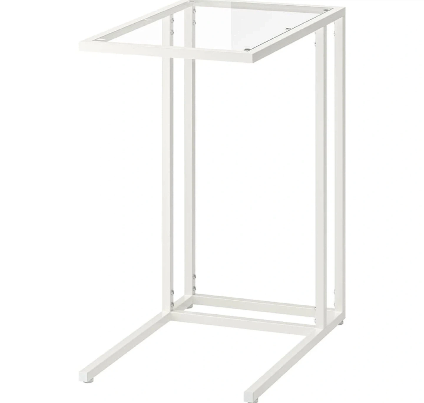 This is a white IKEA Glodde side table. It has a glass top and metal frame. Dimensions are 65 cm height, 55 cm width, and 35 cm depth. It's handy for placing a laptop or drinks next to a couch or chair.