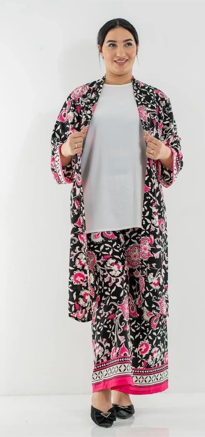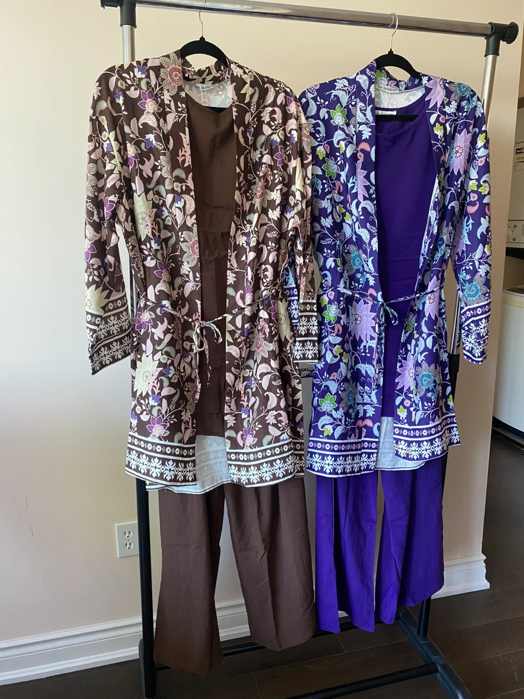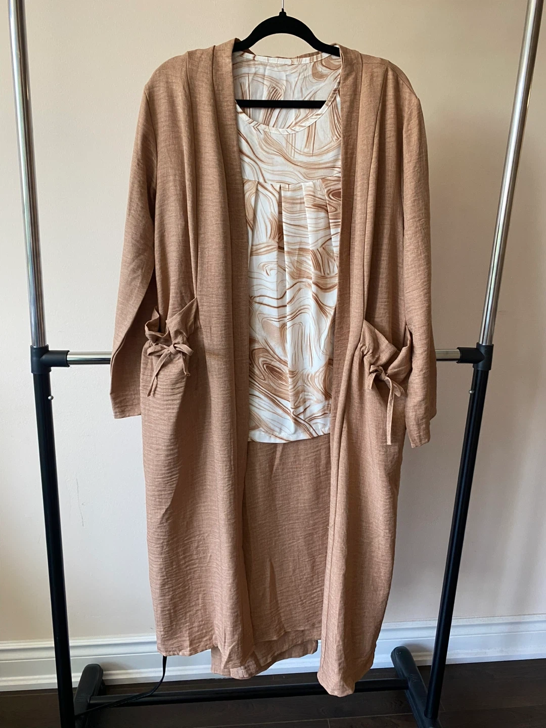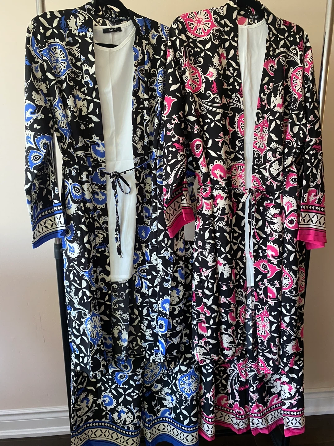 Two long duster jackets in light blue and yellow, both featuring a subtle stripe pattern and a tie belt. They're perfect for layering over any outfit. Material appears to be lightweight fabric.