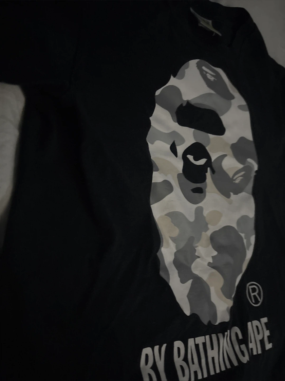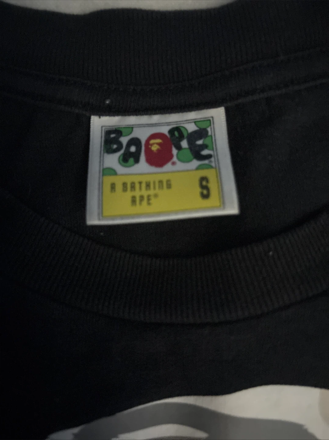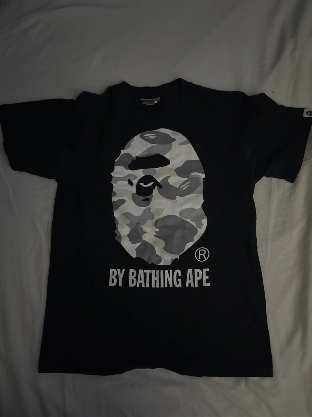 A Bathing Ape t-shirt featuring the iconic camo ape head graphic. Black colourway. Size S. Made from cotton.