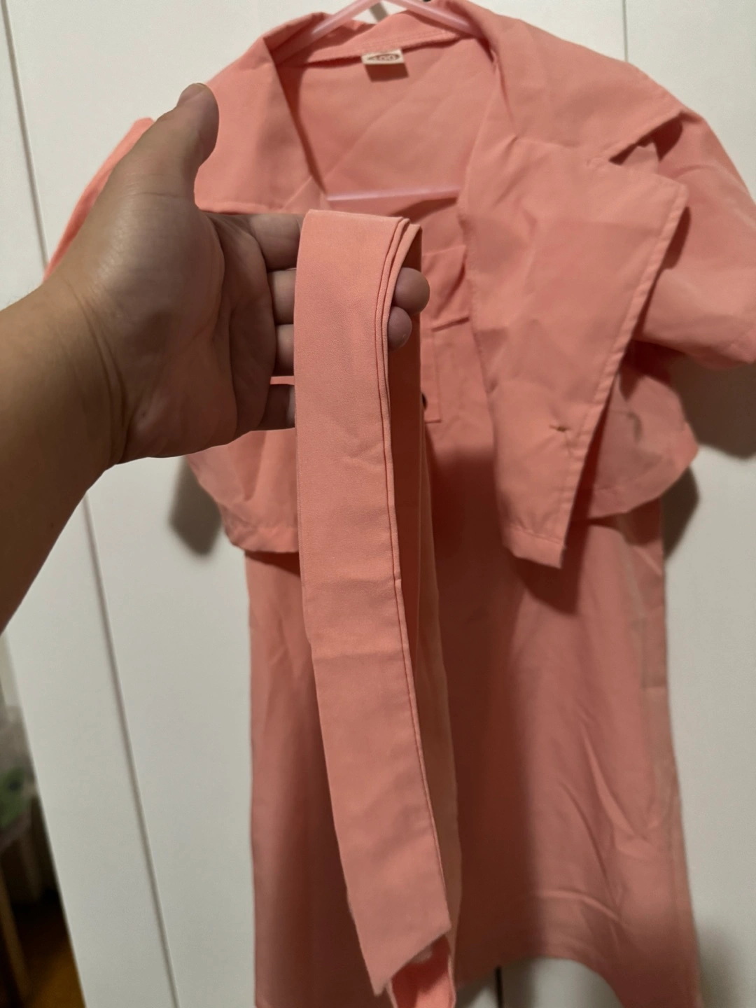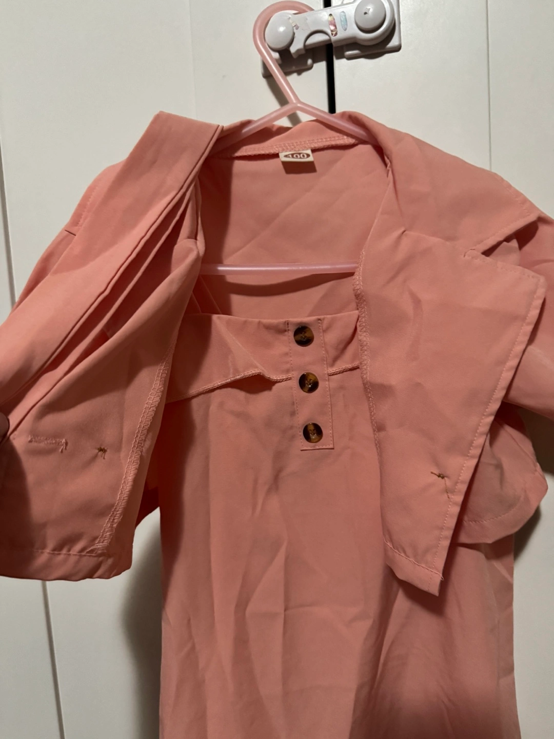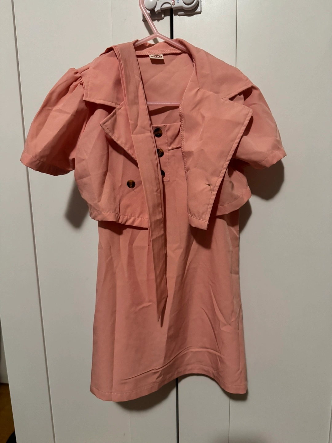Cute peach-coloured dress set. Features a short-sleeved dress and a matching bolero-style jacket. Button closure. Includes a removable tie-belt. Perfect for a special occasion.