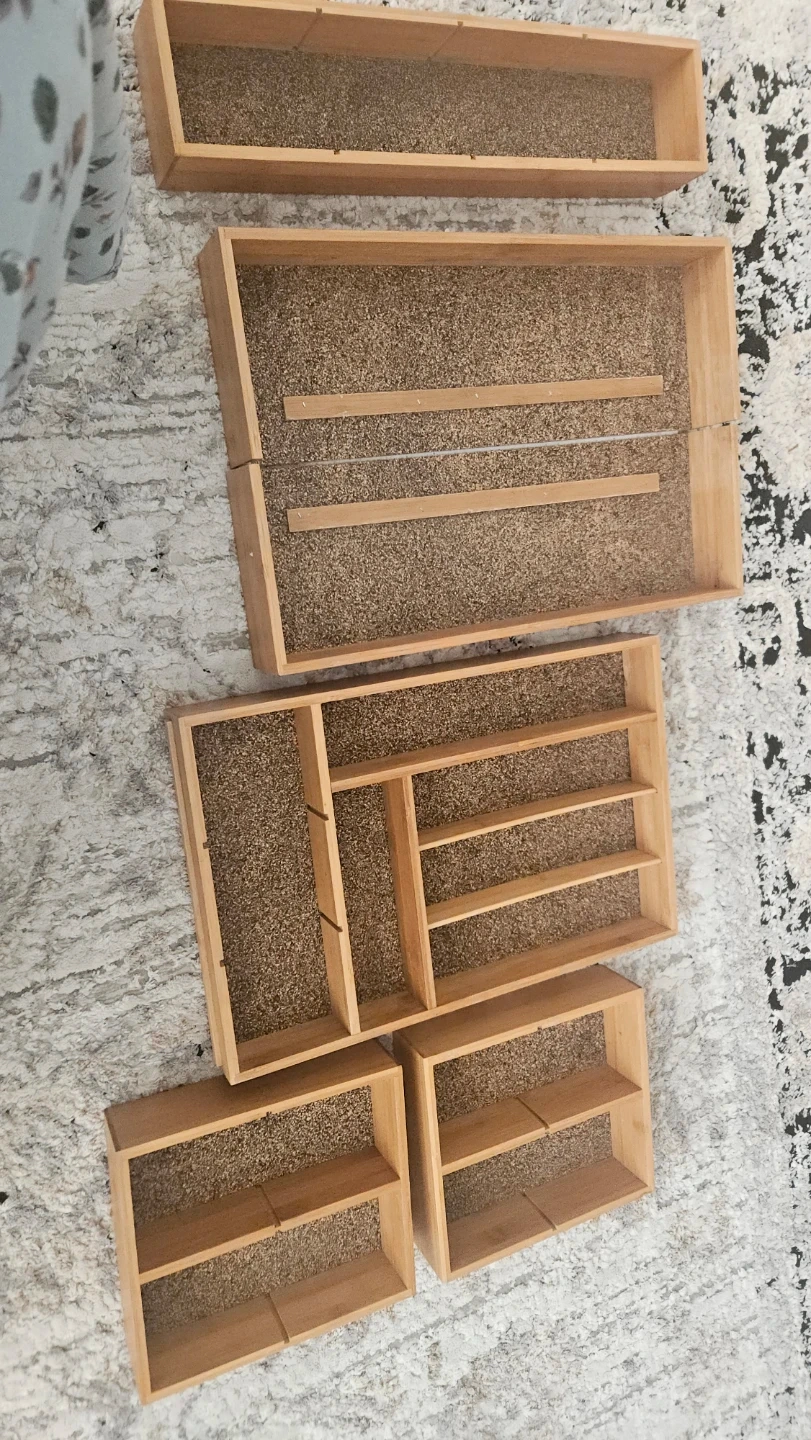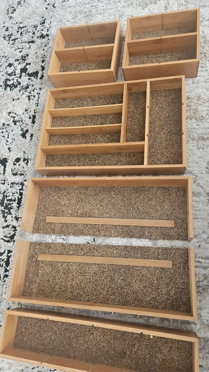 Organize your drawers with this set of five wooden organizers. They're made of natural wood and feature various compartments for different items. Perfect for keeping your kitchen, bathroom, or office tidy!