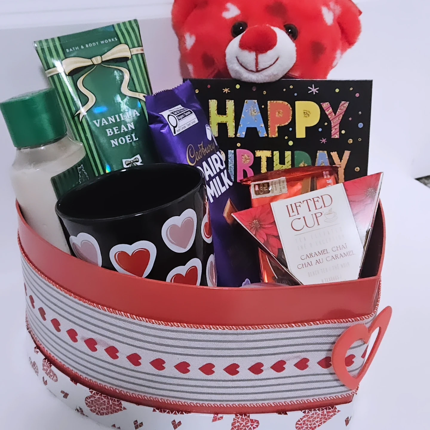 This gift box is packed with goodies for a special birthday celebration. It includes a soft plush, assorted chocolates and a selection of tea, along with a products from Bath & Body Works. A festive mug, scented candle and a 'Happy Birthday' card are also part of the set.