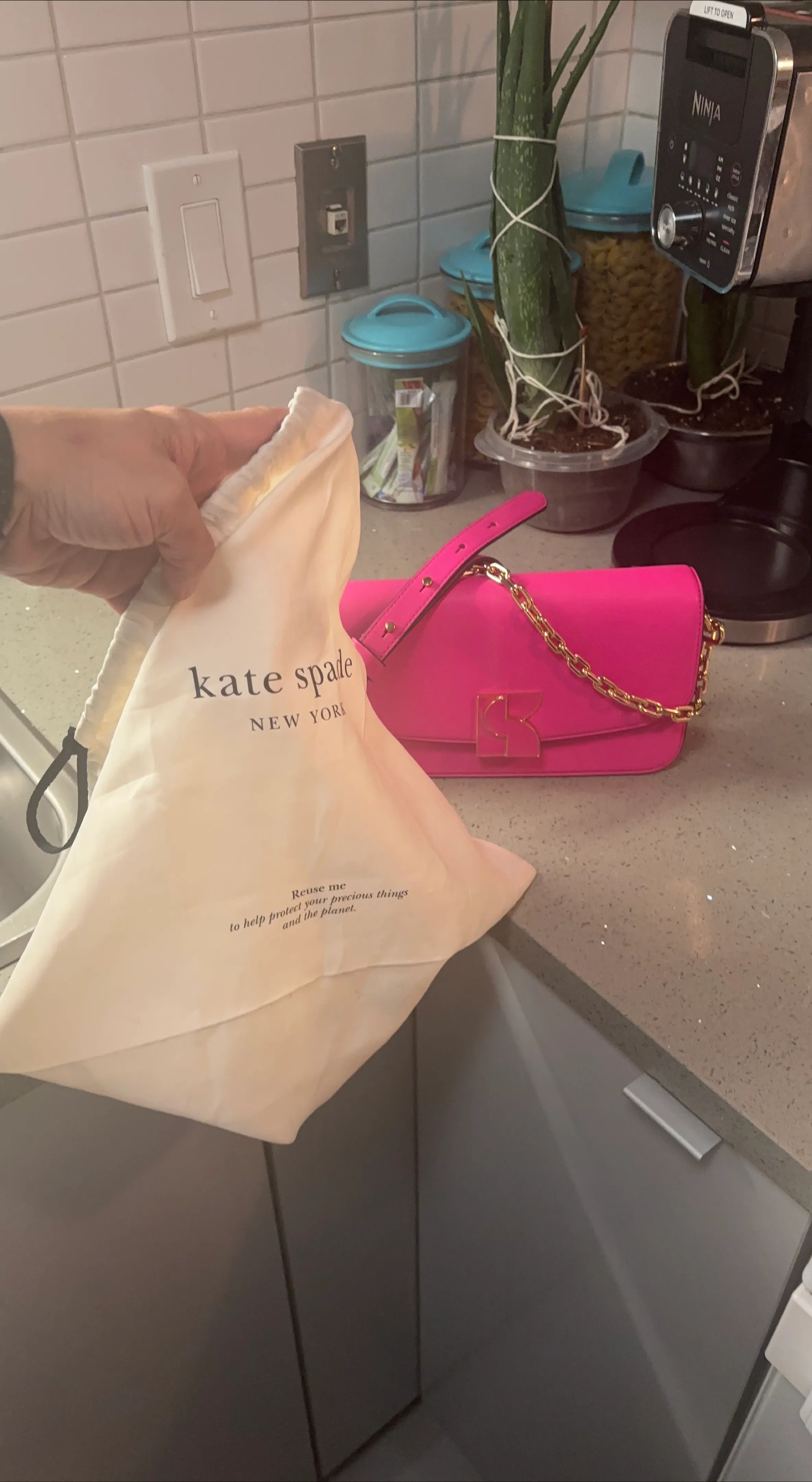 Kate Spade New York shoulder bag in a vibrant pink. It features a gold chain strap and a distinctive gold logo clasp. Includes original dust bag for protection. A stylish accessory for any occasion!