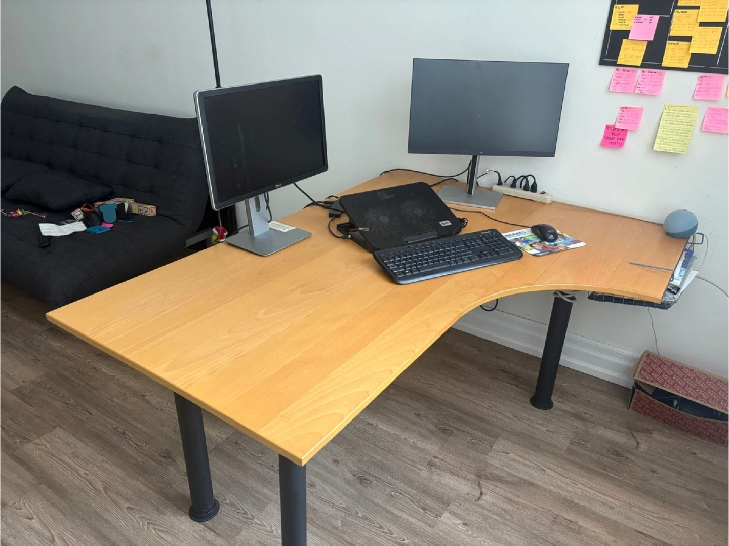 L-shaped corner desk with a natural wood finish. It's sturdy and offers a good amount of surface area. This desk is perfect for setting up a home office or workspace. It's ready for a new home!