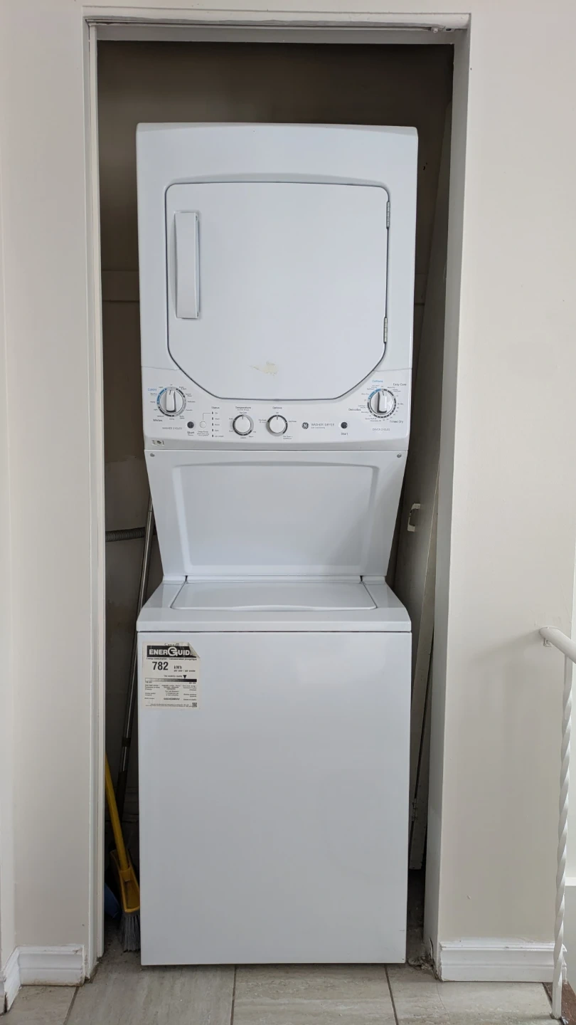 This is a white GE stackable washer and dryer unit. It's compact and space-saving. It features separate controls for washer and dryer cycles. Great for smaller living spaces!