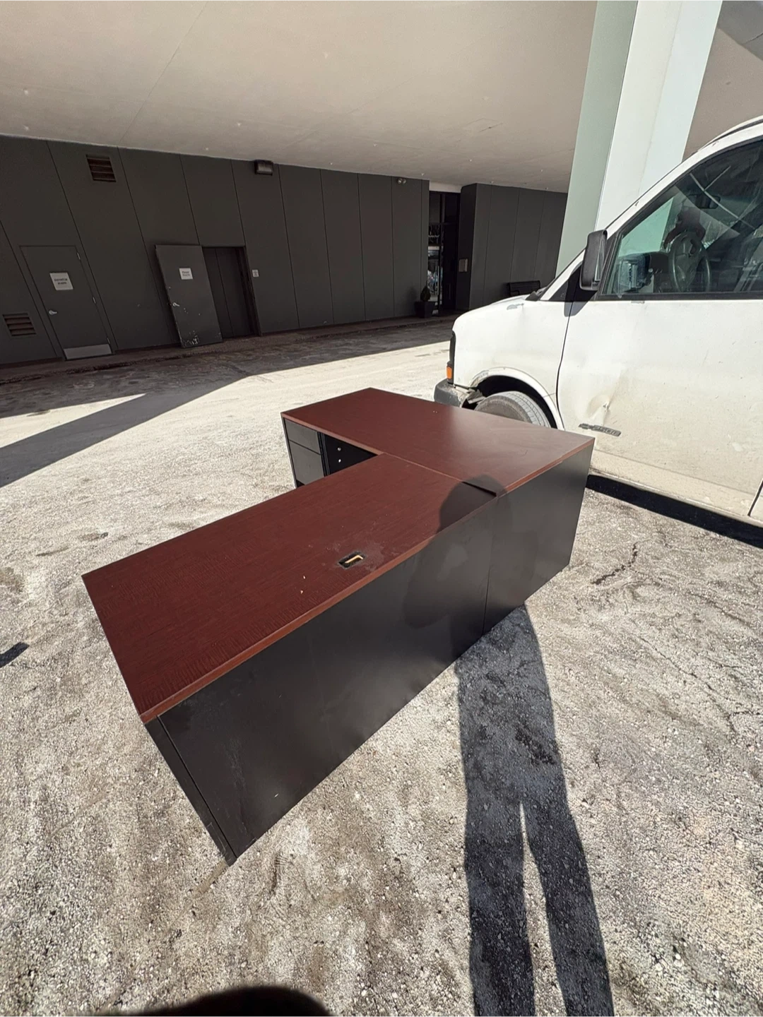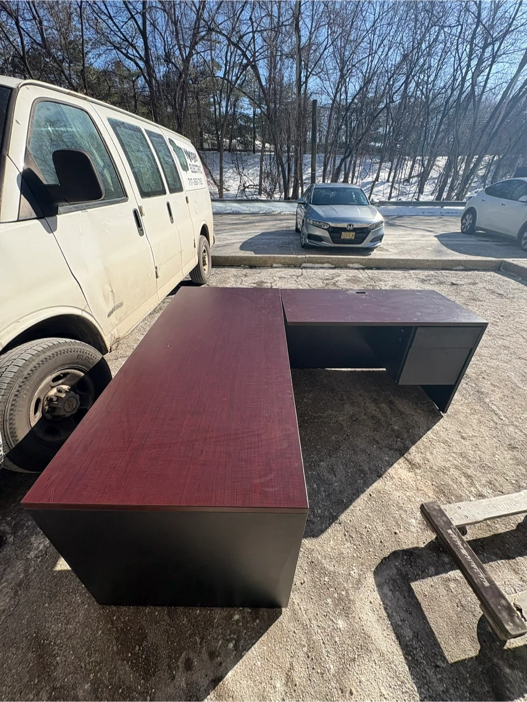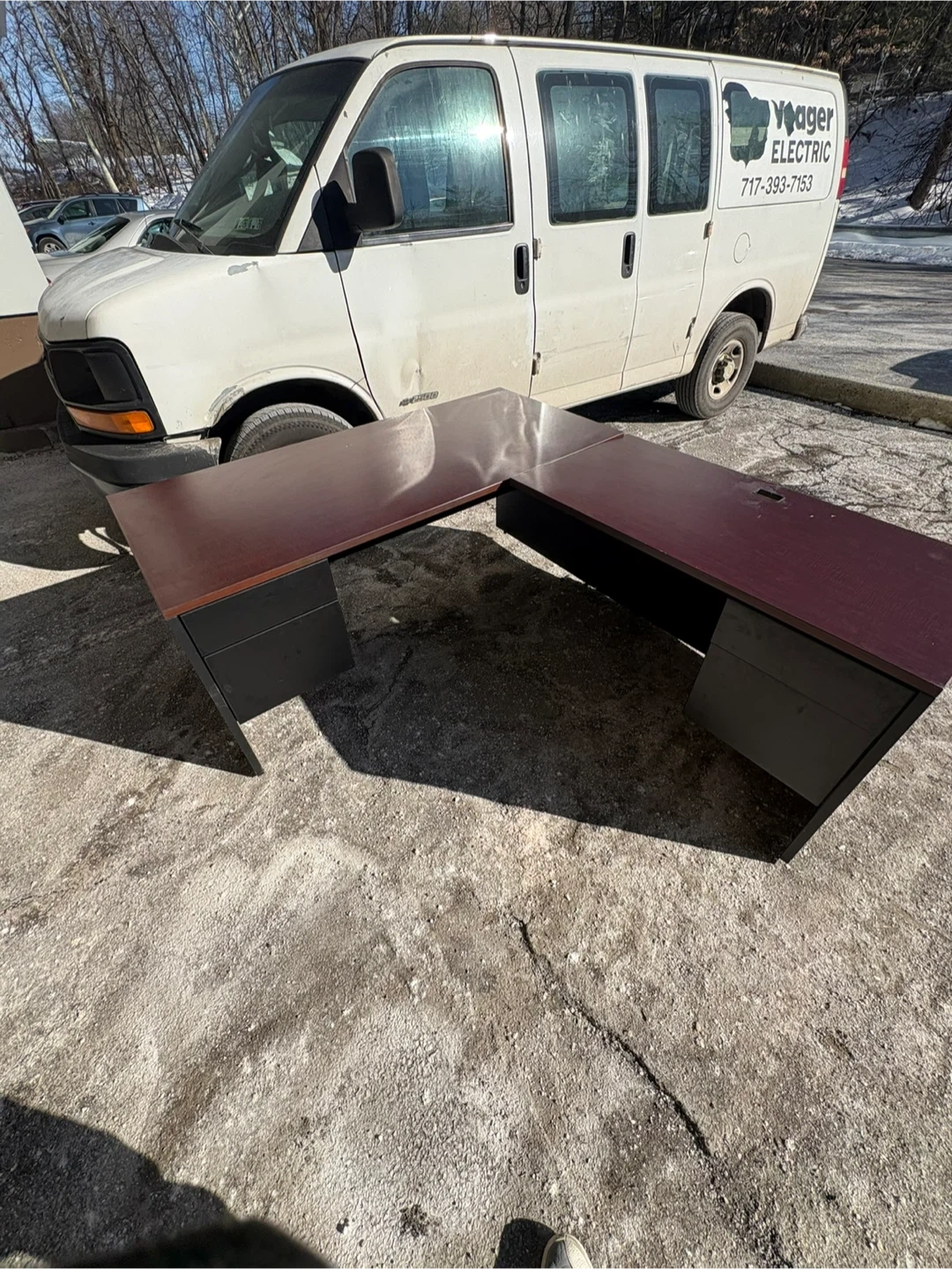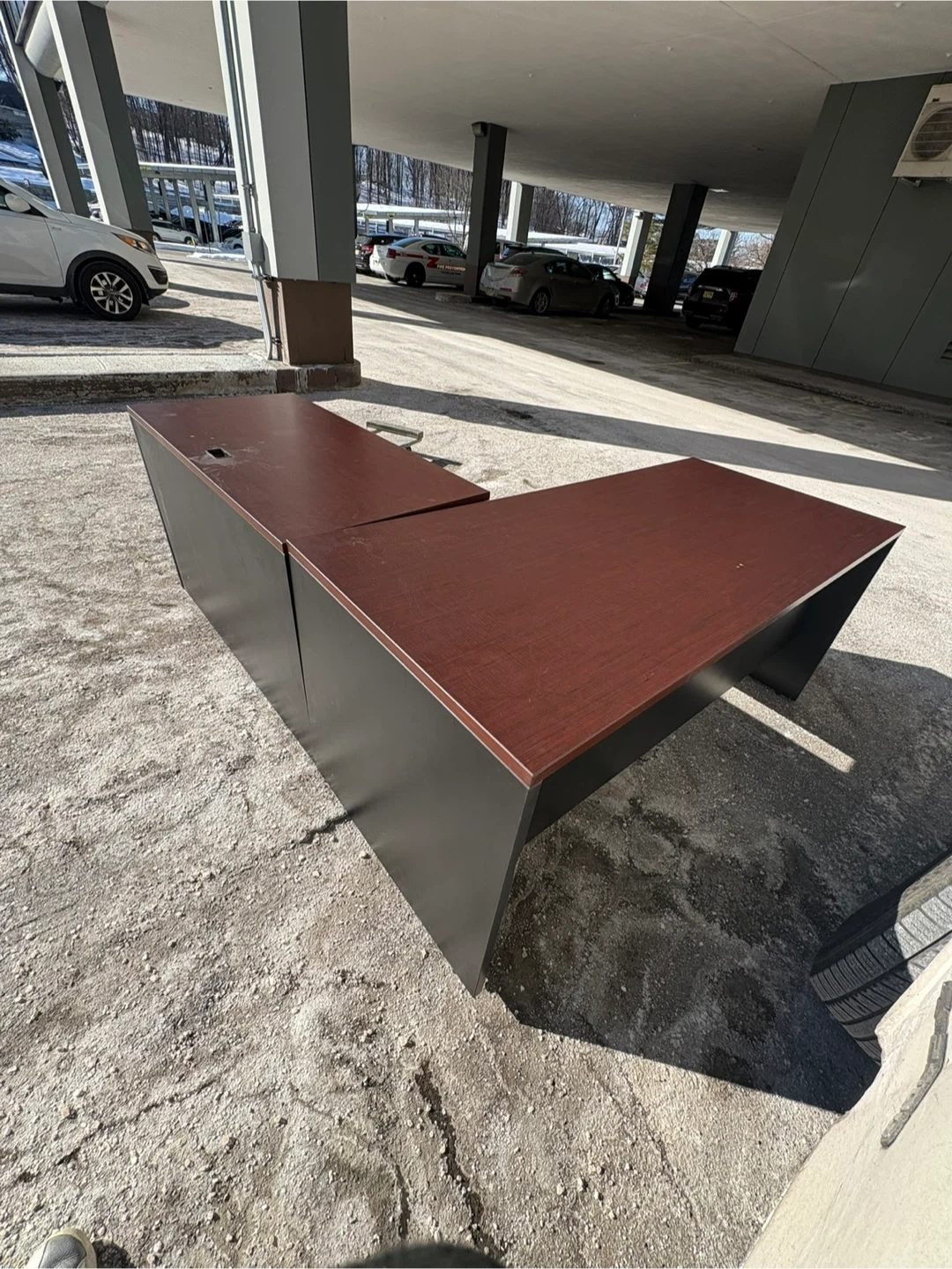 L-shaped office desk with a cherry wood laminate top and dark grey base. It features drawers on one side. Perfect for a home office or commercial space.