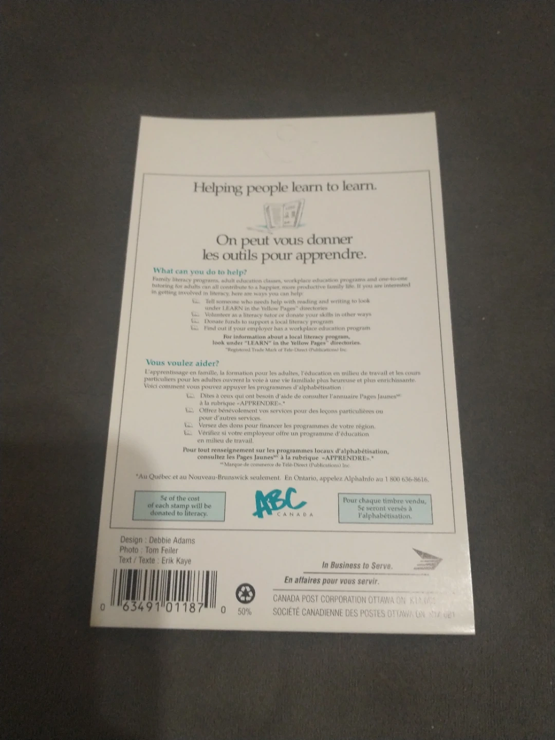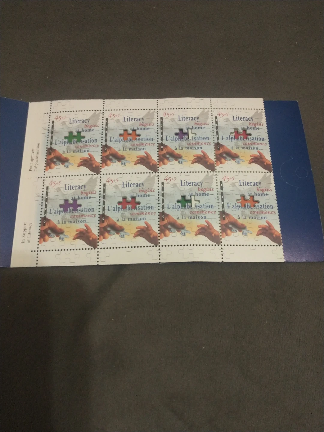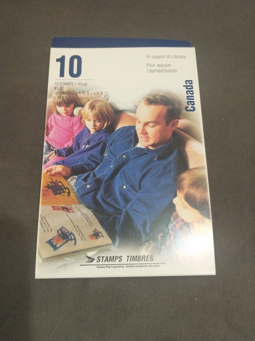 201In box 11. Selling a set of 10 Canada Post stamps supporting literacy! Each stamp is 45¢ + 5¢, making the total face value $5.00. Perfect for collectors or anyone who wants to support a good cause while sending mail!