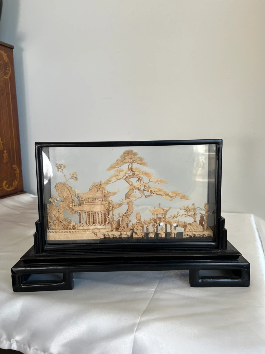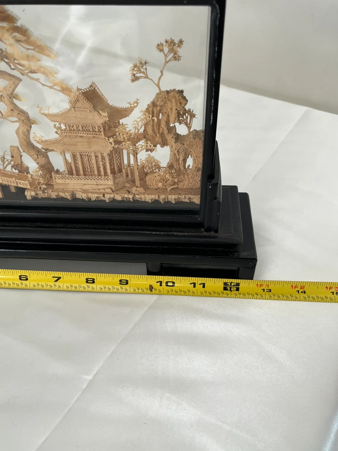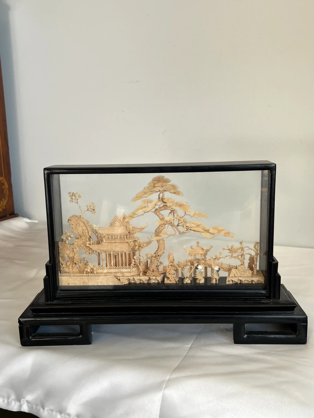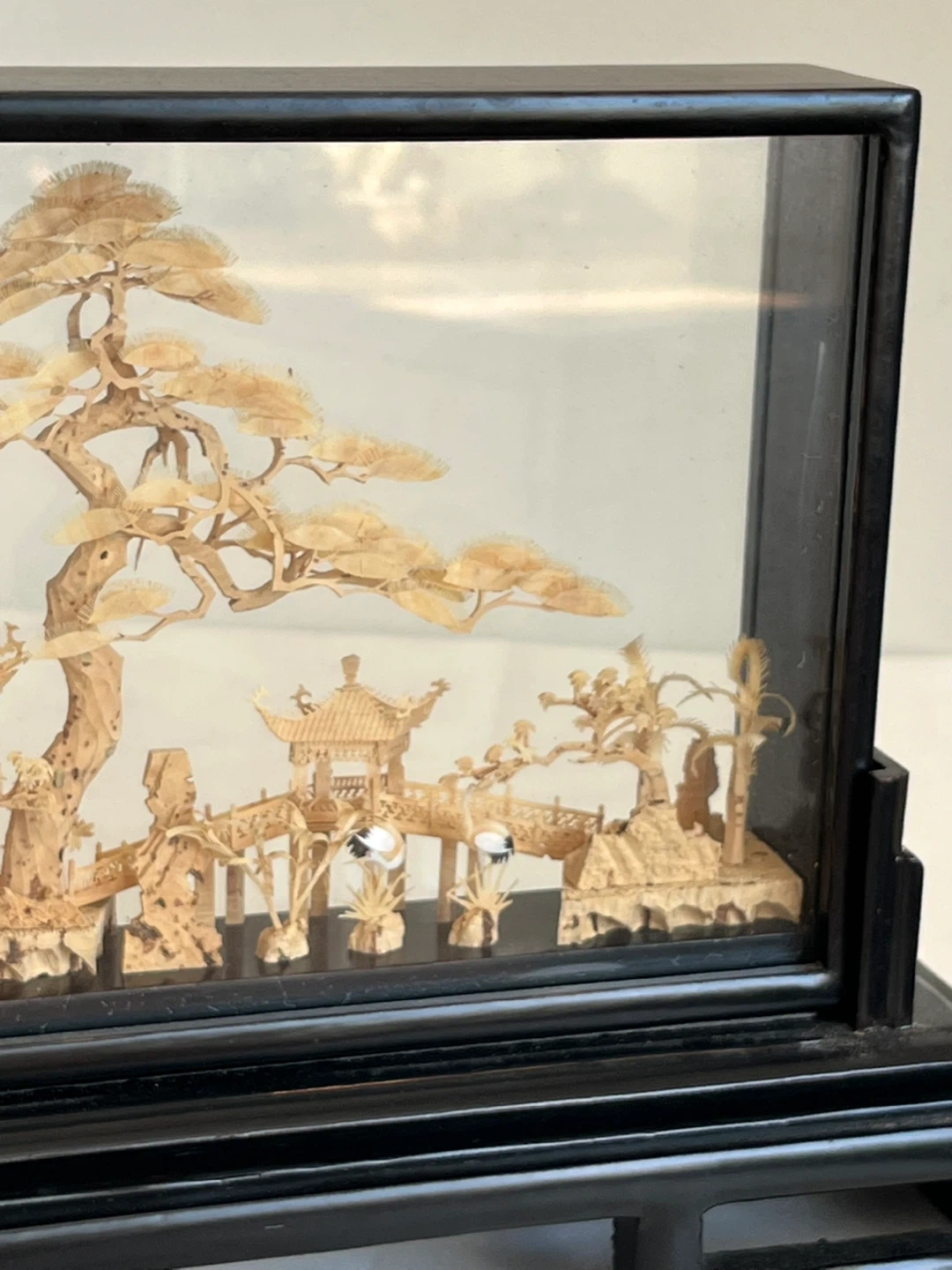 A detailed carved cork diorama enclosed in a glass case with a black wooden stand. It depicts a traditional Asian landscape with pagodas, trees, and cranes. This intricate piece would make a lovely decorative accent. Measures approximately 12” wide.