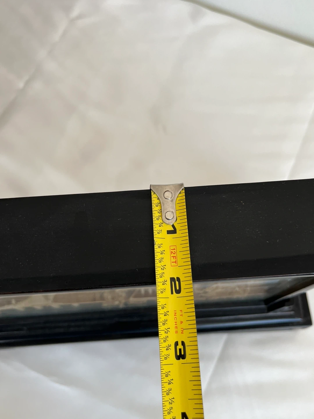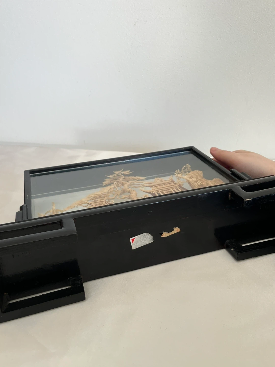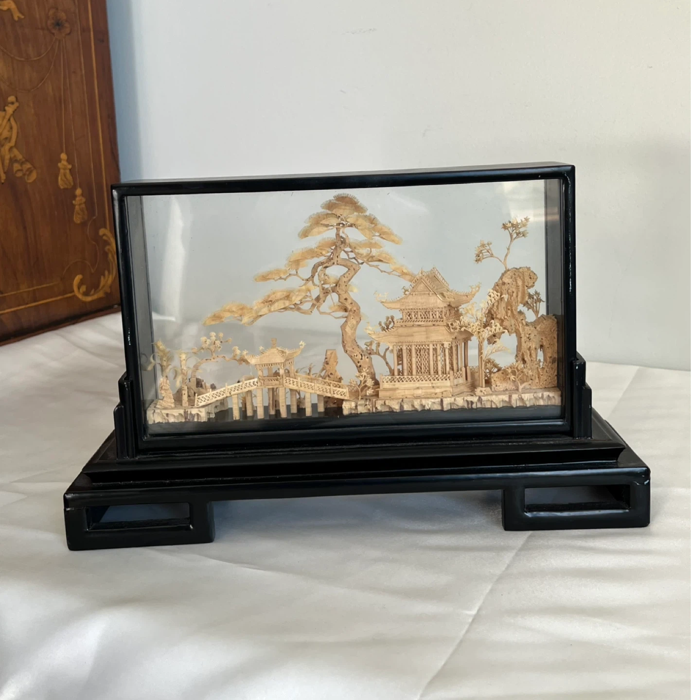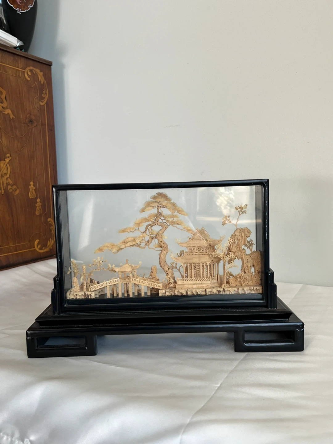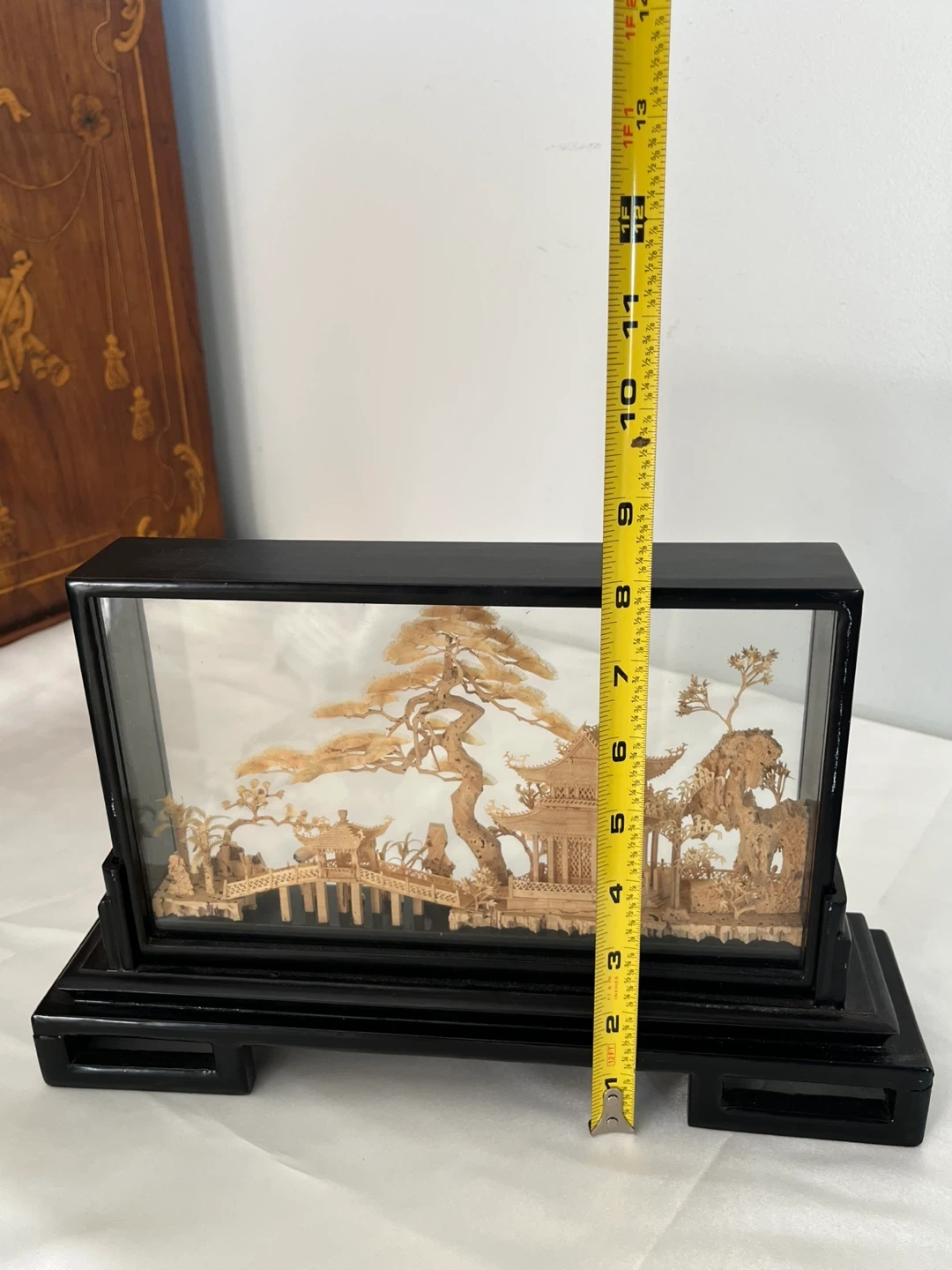 A detailed carved cork diorama enclosed in a glass case with a black wooden stand. It depicts a traditional Asian landscape with pagodas, trees, and cranes. This intricate piece would make a lovely decorative accent. Measures approximately 12” wide.