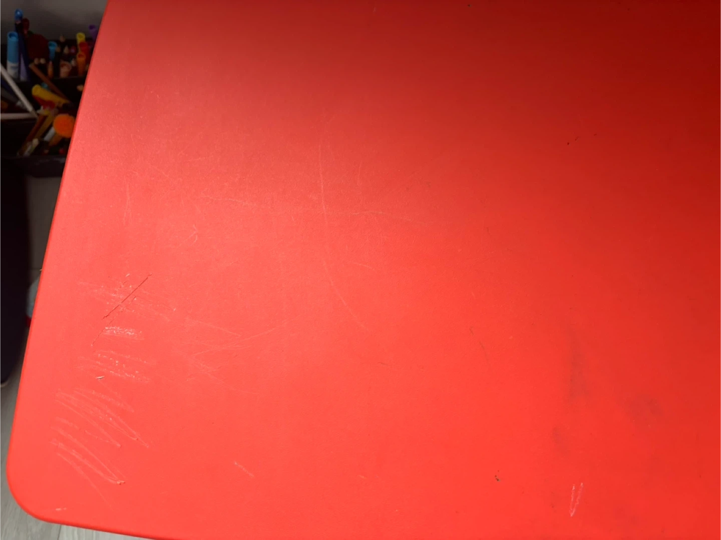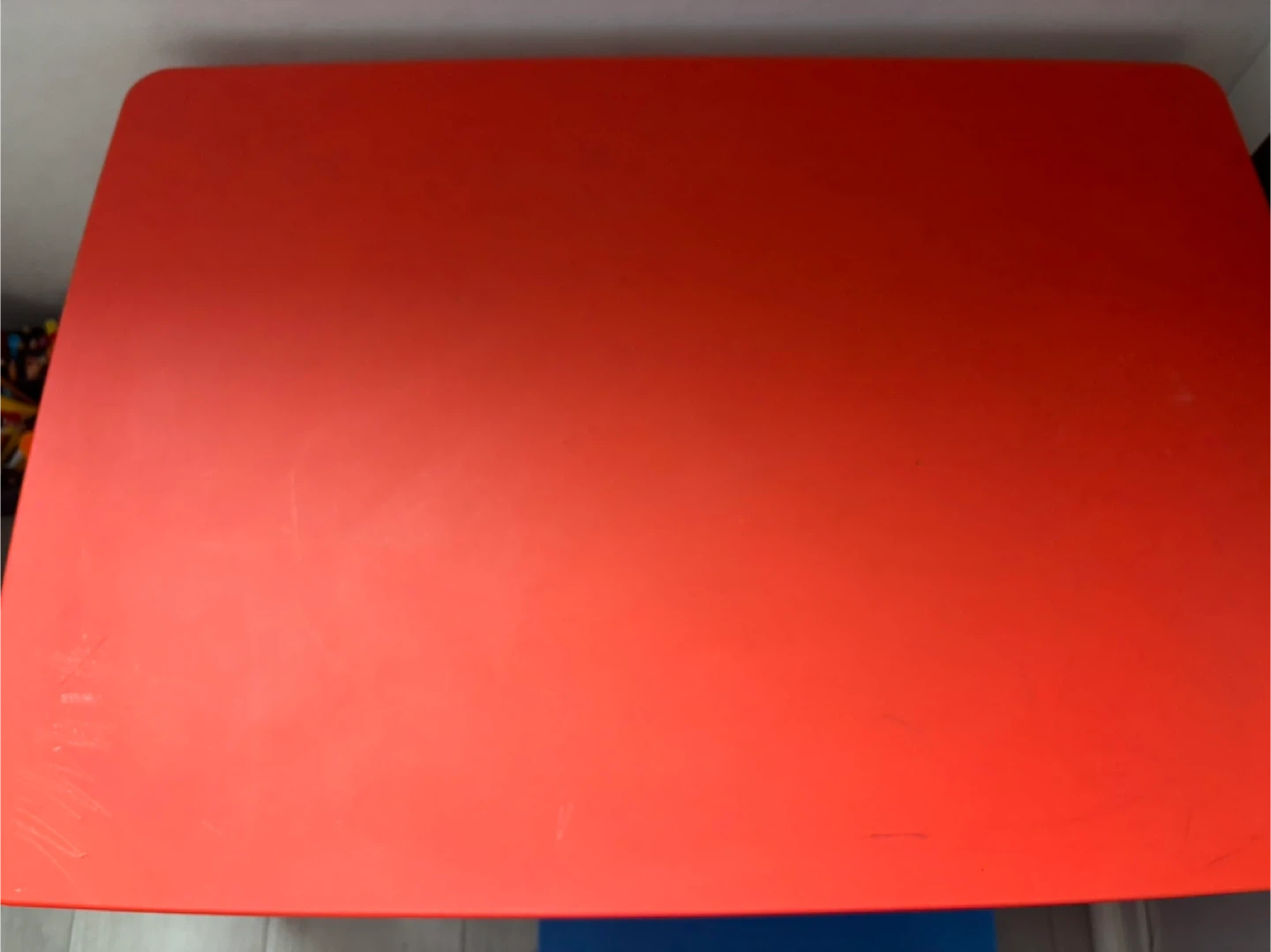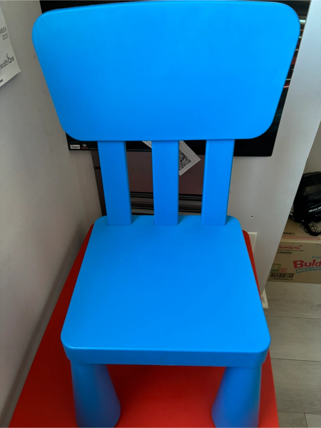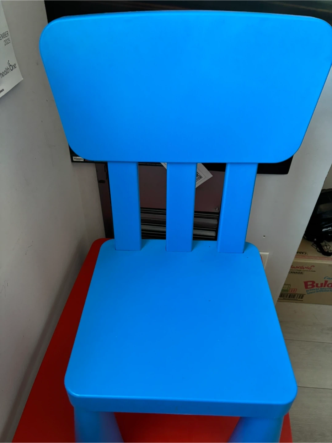 This is an IKEA red children's table and a blue child's chair. They're made of plastic and are perfect for little ones' play or craft time. The table has some minor scuffs. The chair is sturdy and comfortable.