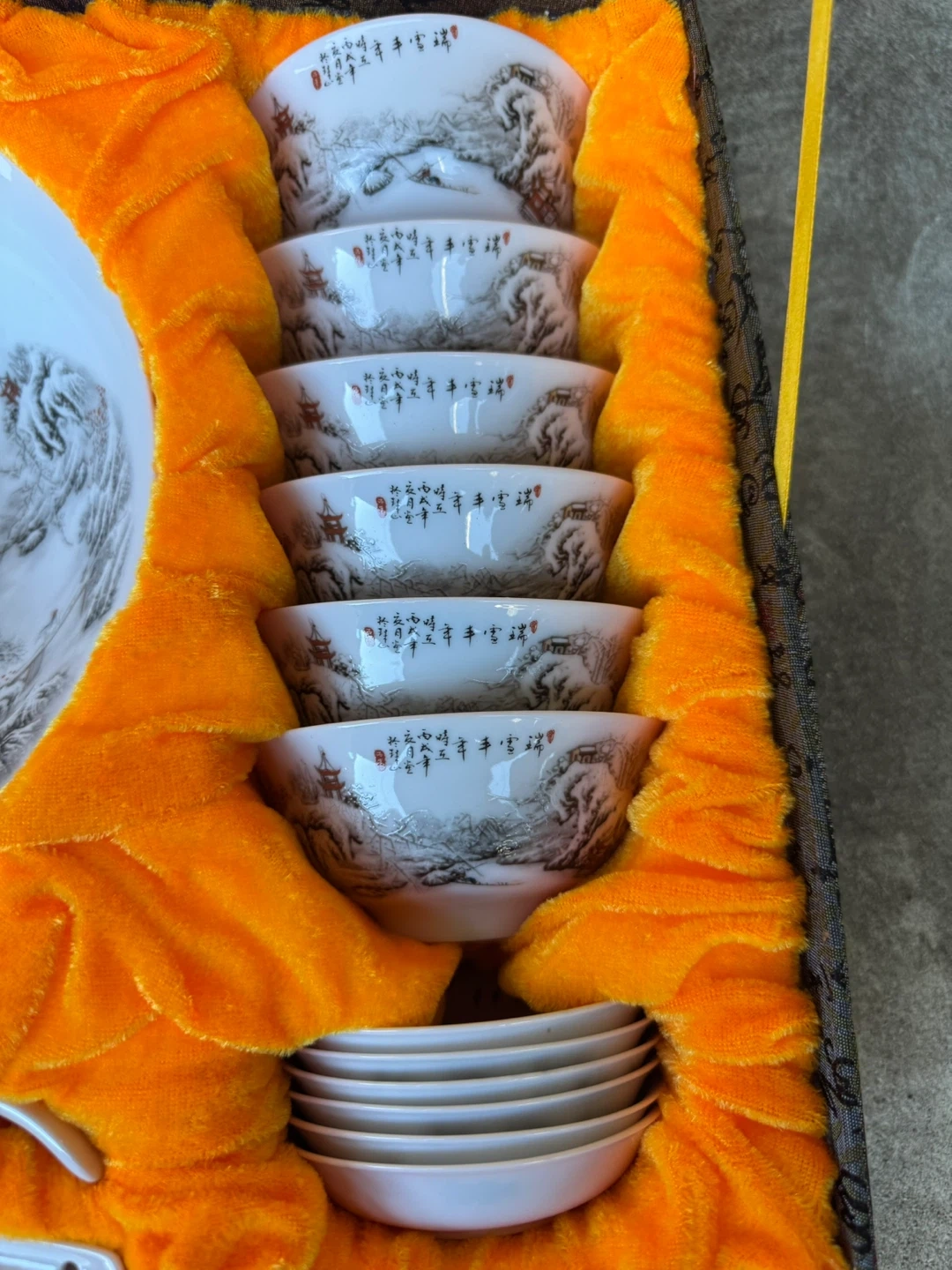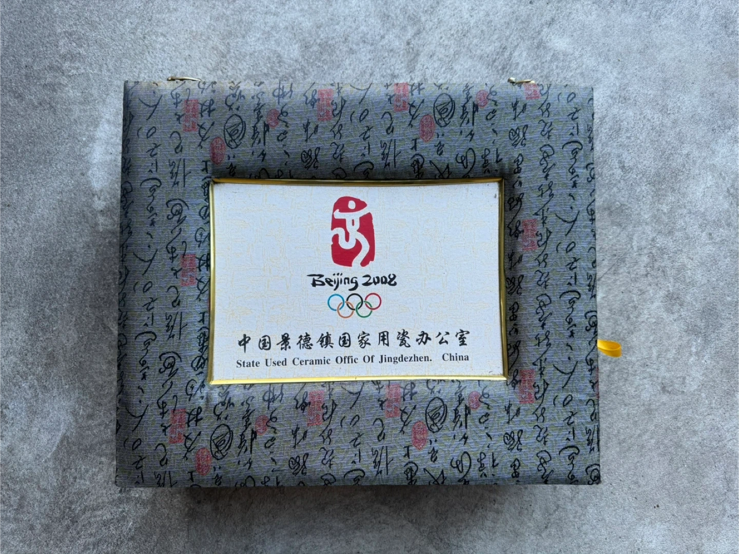 This is a ceramic tea set from the Beijing 2008 Olympics. It includes a large serving bowl, six small tea bowls, two spoons, and two small dishes. The set comes in a decorative presentation case.
