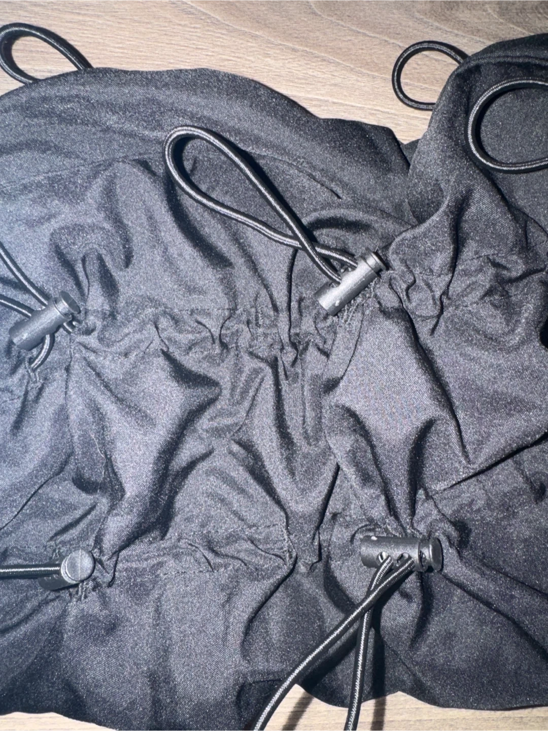 81Selling a pair of mnml Bungee Cord Pants in black, size large. These pants have a unique design with bungee cord detailing throughout. They can be stacked and worn as a statement piece for a streetwear look or for a rave/party. They are brand new, with tags and ready for a new home!