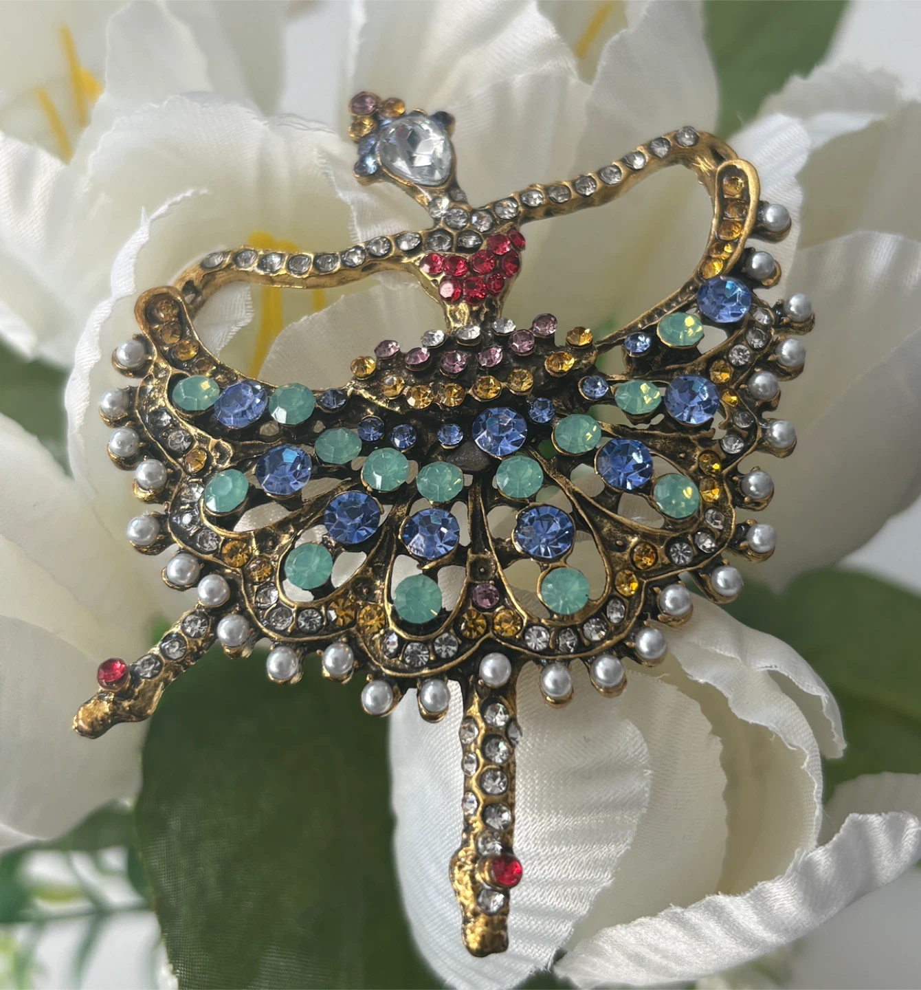 This stunning brooch features a detailed ballerina design encrusted with colourful rhinestones and faux pearls. It's made from gold-tone metal and has a secure clasp. Perfect for adding a touch of sparkle to any outfit!