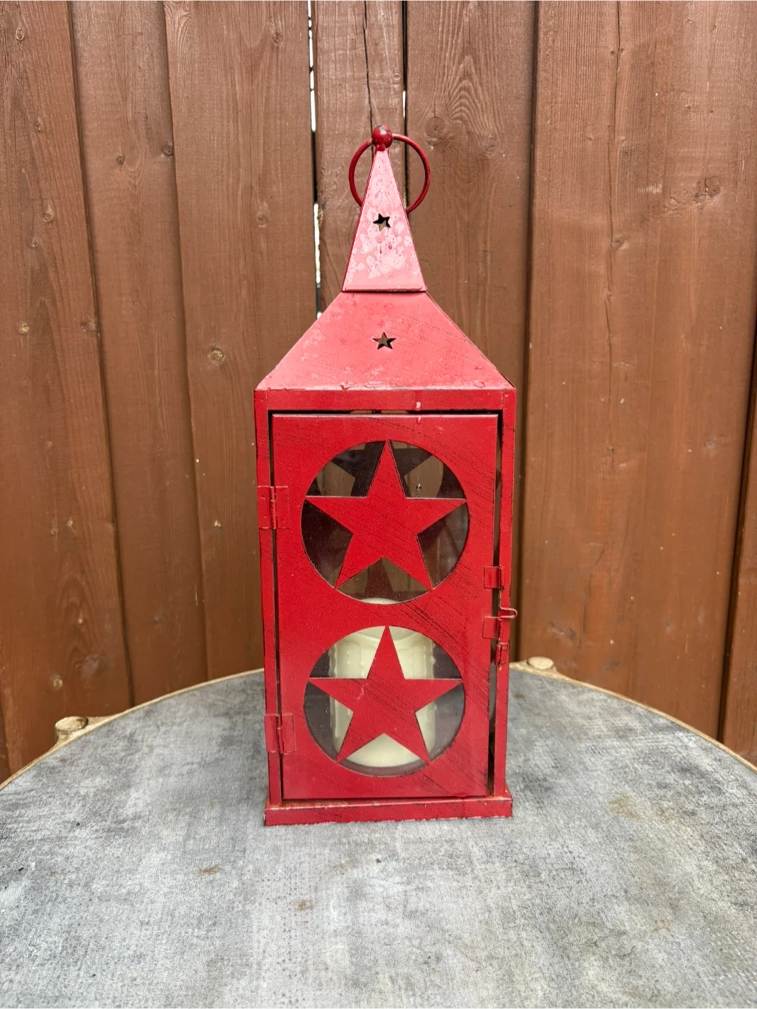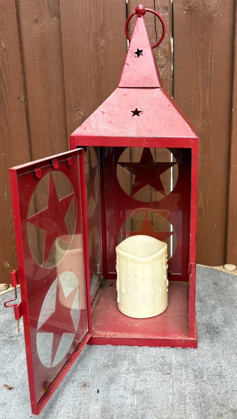 This rustic red metal lantern features charming star cutouts on each side, offering a country-inspired look. It comes with a cream-coloured, drippy wax candle inside for a cozy ambiance. It's perfect for adding a warm glow to your porch or patio.
