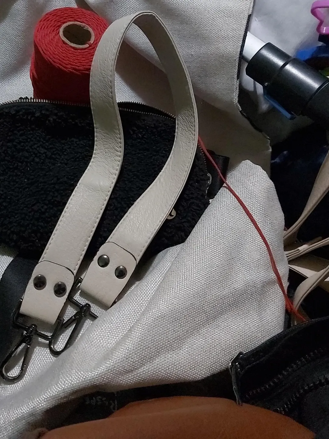 A cream-coloured leather strap for a handbag. It features silver-tone hardware for attachment. The strap is approximately 2cm wide.