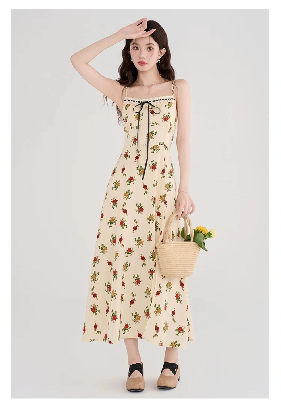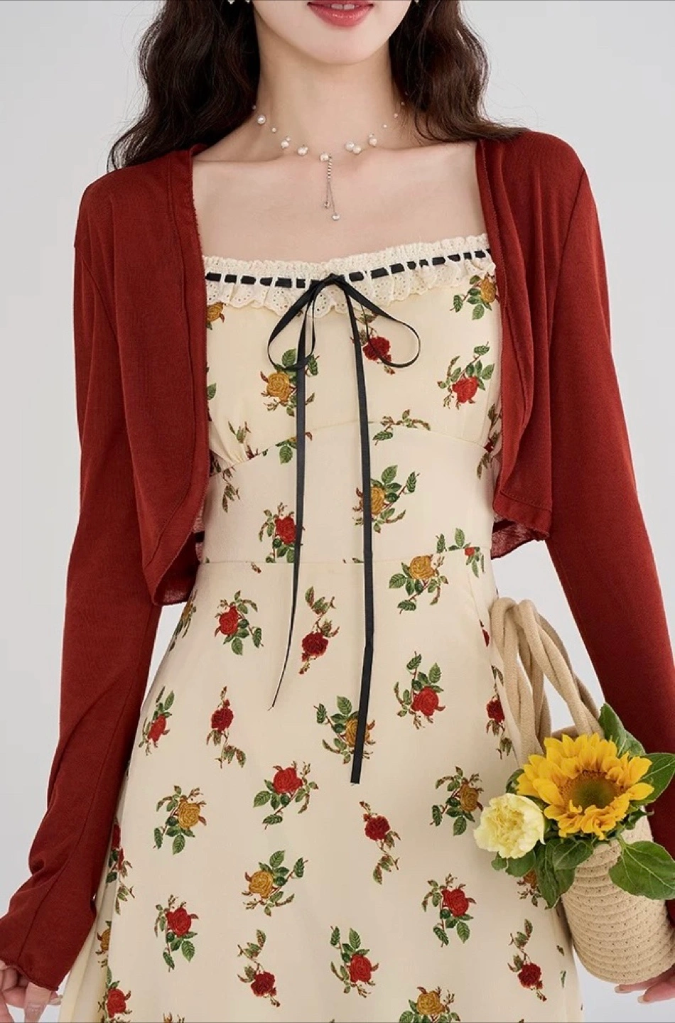This is a lovely floral print midi dress that comes with a matching cardigan. The dress features a delicate floral pattern and a flattering silhouette. It's perfect for a variety of occasions! The cardigan complements the dress beautifully, adding a touch of warmth and style.