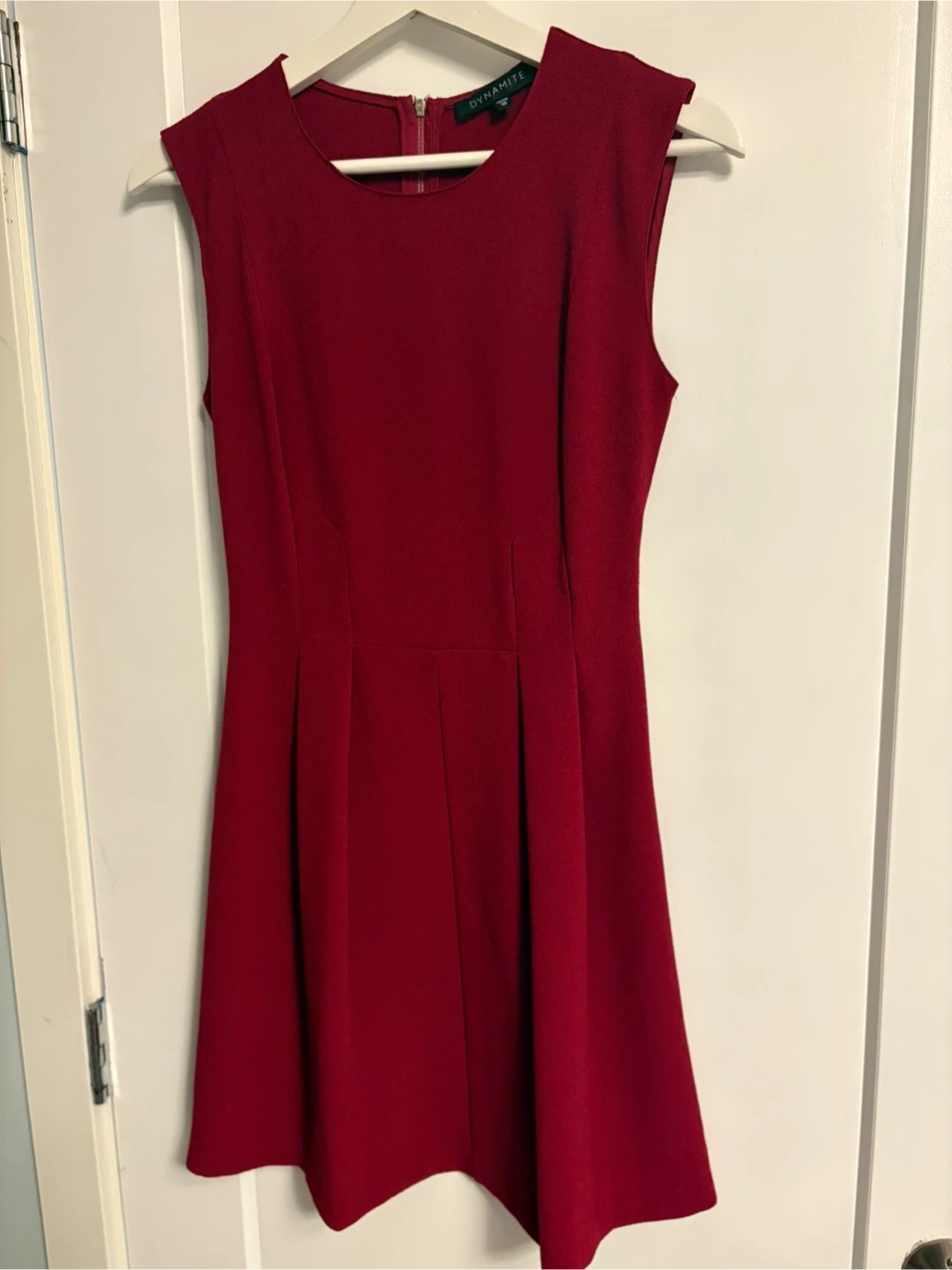 This Dynamite dress is a vibrant red, sleeveless fit and flare style. It features a concealed back zipper for closure. The material feels like a textured crepe. Perfect for dressing up or down!