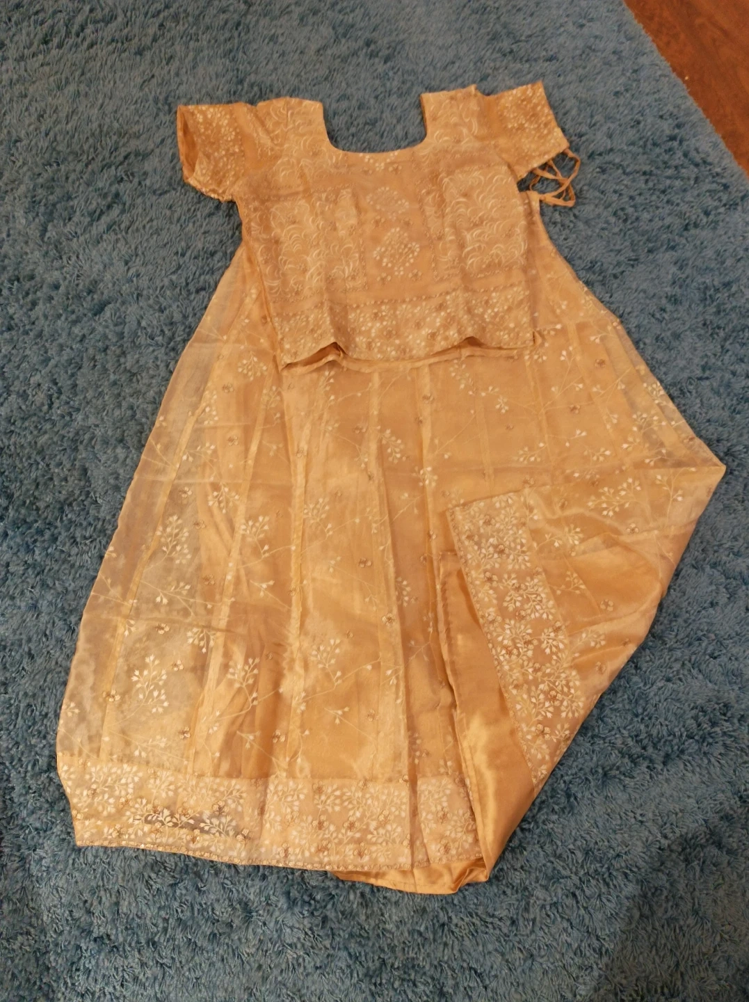 This is a beautiful peach coloured lehenga choli set for girls. It features intricate embroidery throughout the skirt and top. The set includes a top with short sleeves and a matching skirt with a drawstring waist. It's perfect for special occasions and festive events!