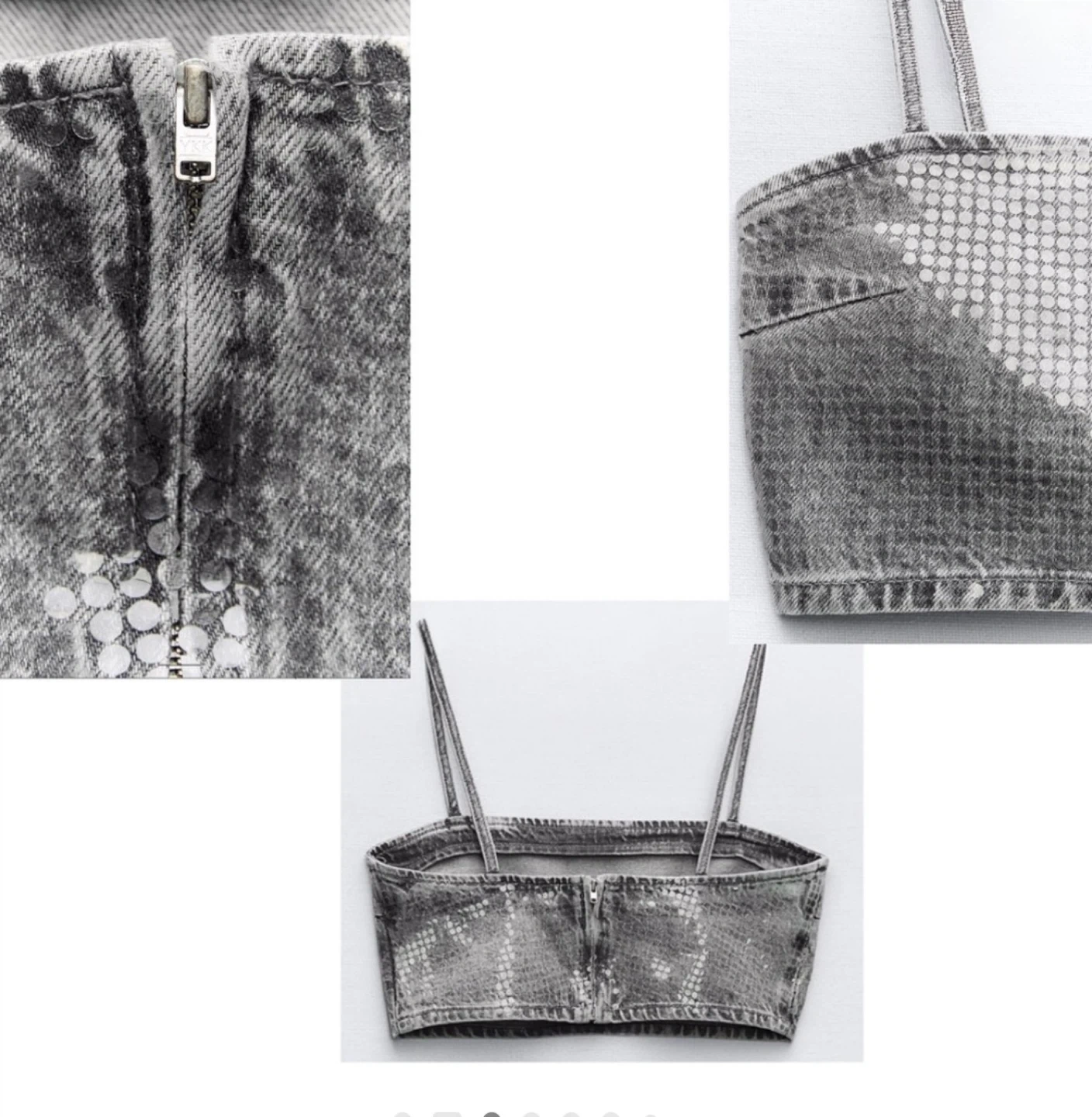 Sparkly grey denim crop top with foil sequin embellishments. It has a zip-up front and thin shoulder straps. Material is denim.