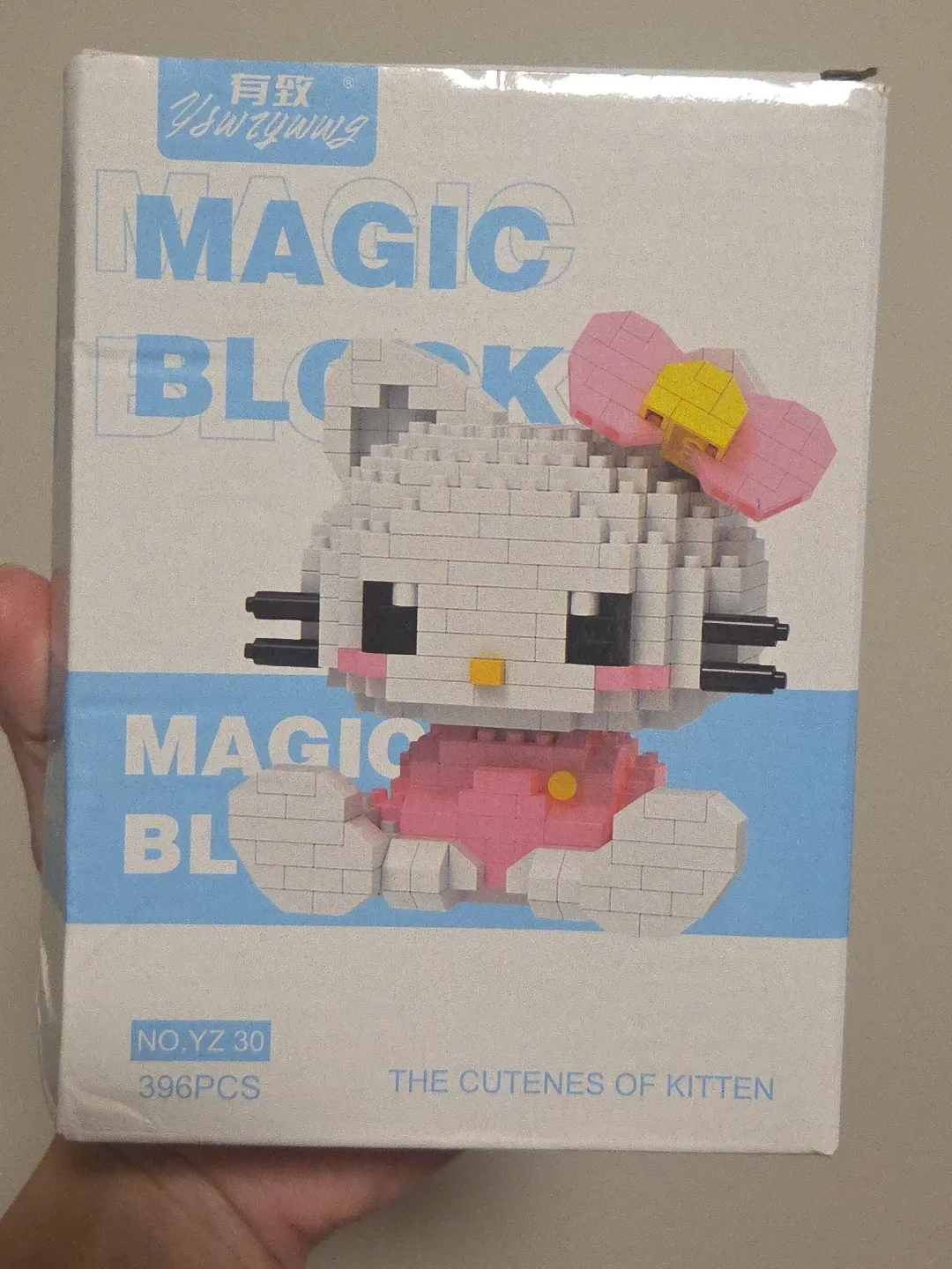 This is a Magic Block building set featuring a Hello Kitty design. It contains 396 pieces for assembly. It's a fun craft for builders who enjoy miniature brick sets!