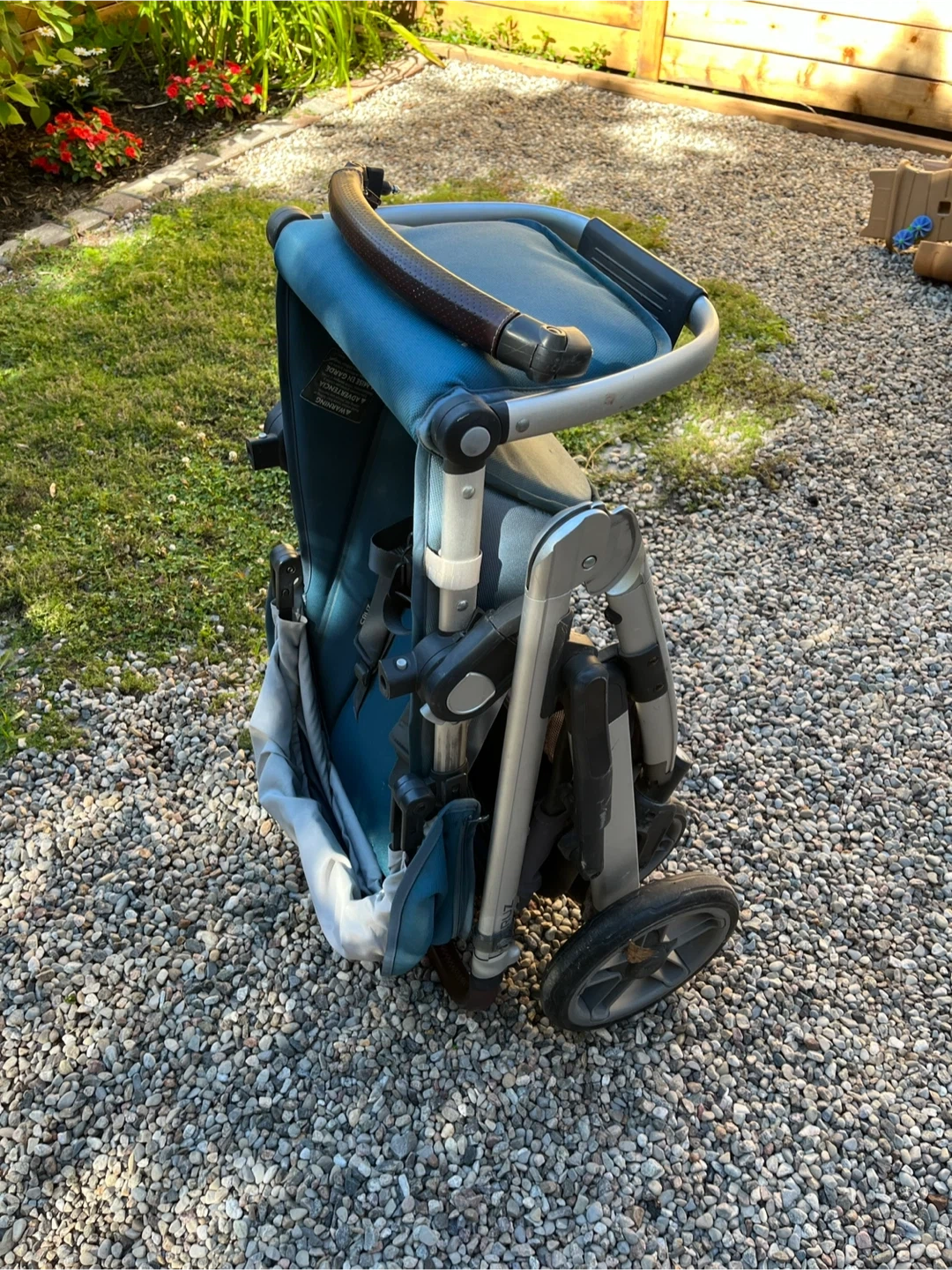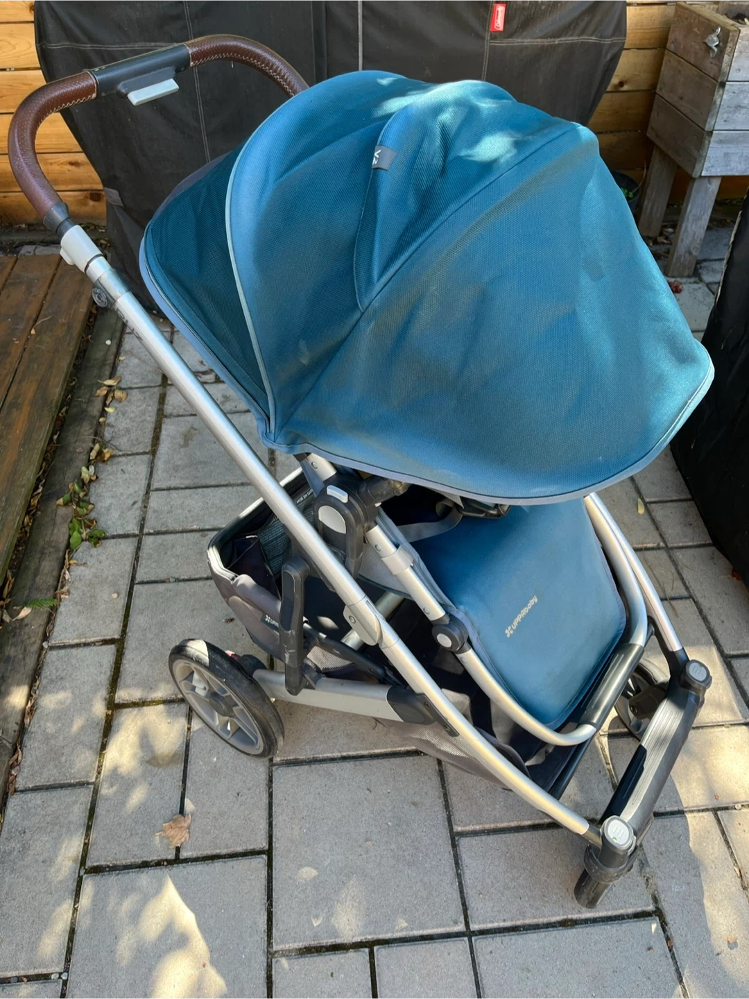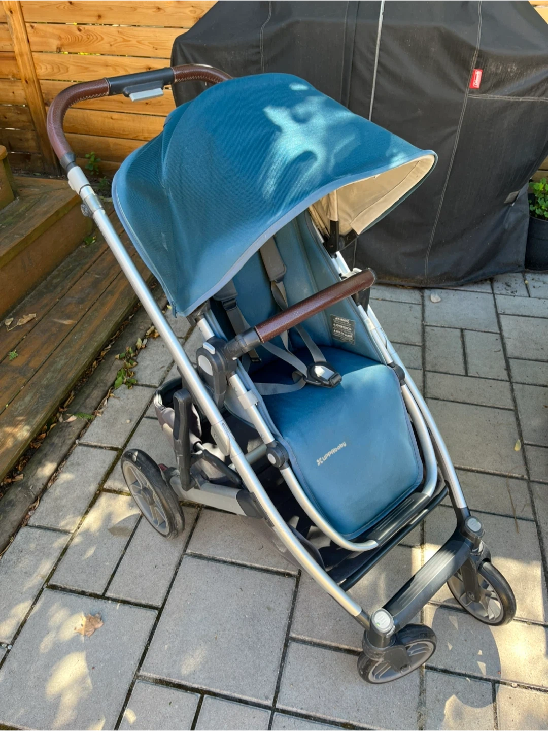 This is an UPPAbaby Vista stroller in a teal/blue colour. It features a reversible toddler seat with a five-point harness. It also includes a large storage basket. Perfect for navigating city streets or park trails!