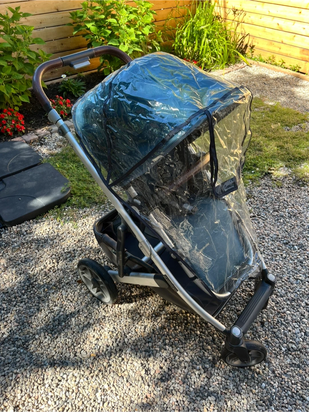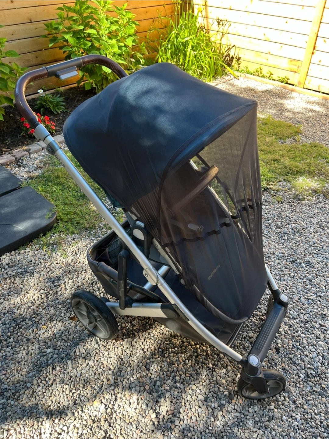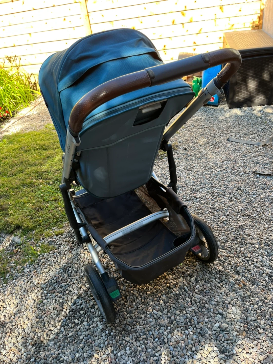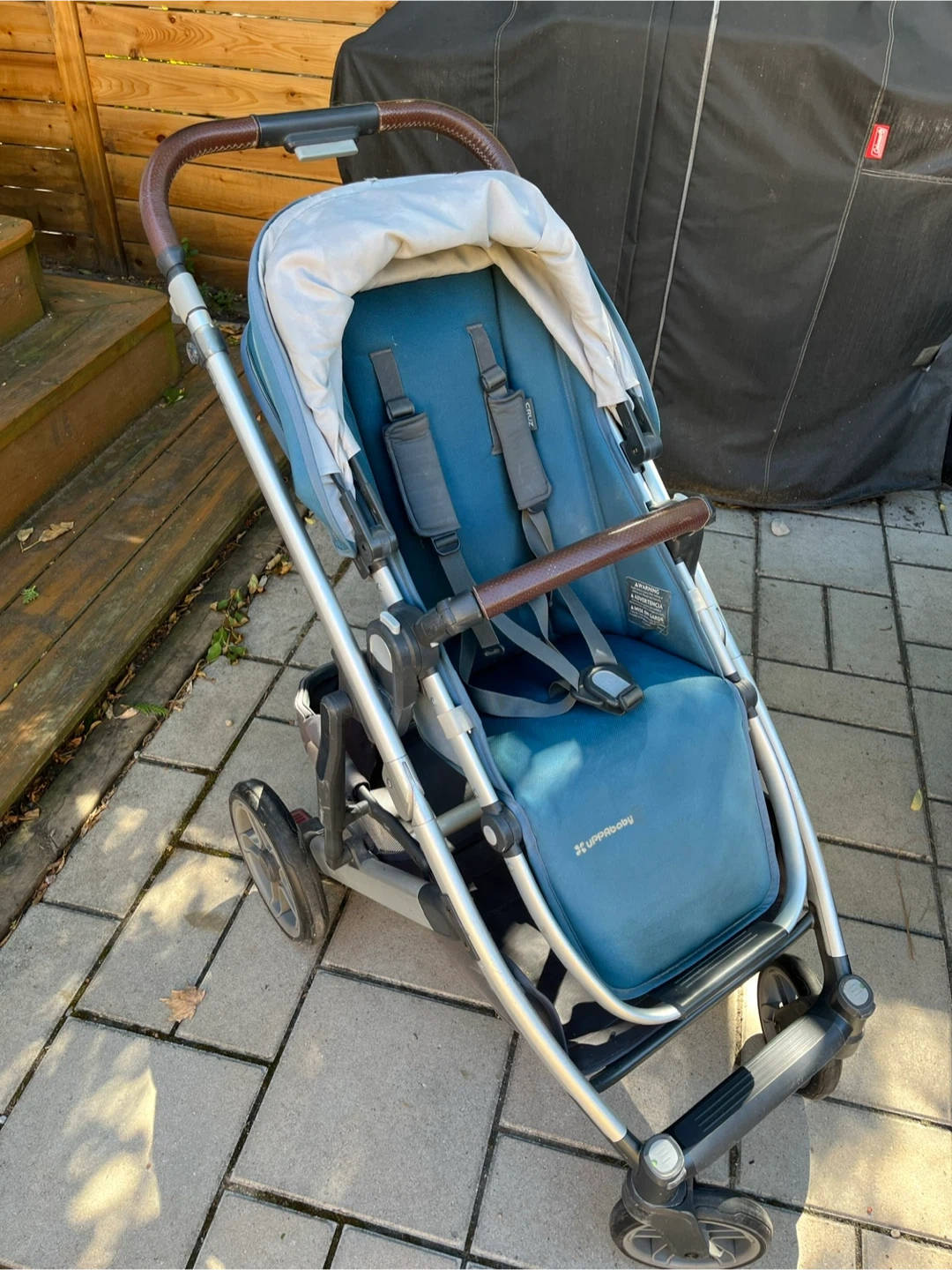 This is an UPPAbaby Vista stroller in a teal/blue colour. It features a reversible toddler seat with a five-point harness. It also includes a large storage basket. Perfect for navigating city streets or park trails!
