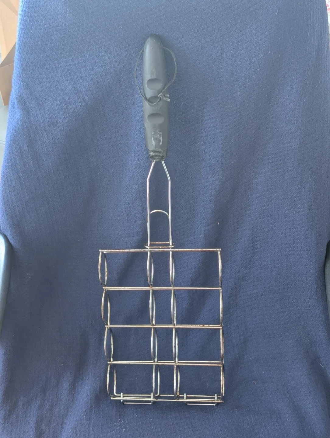This is a metal grill basket with a black plastic handle. It's designed to hold food securely while grilling. The basket has a wireframe construction.